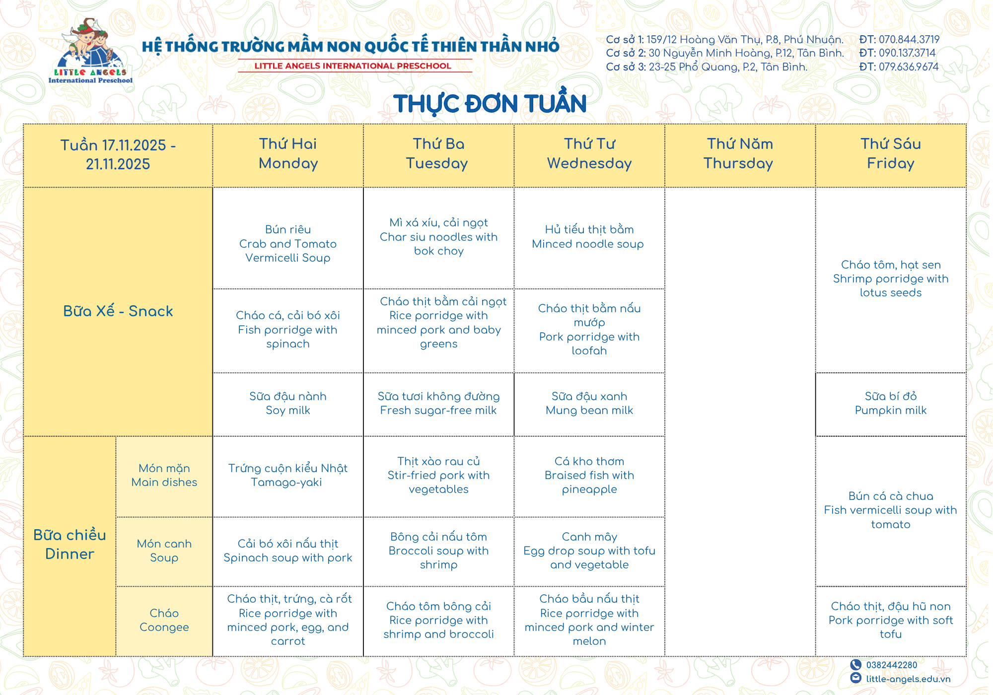 Nhà Trường xin gửi đến Quý Phụ huynh thực đơn các bữa ăn trong tuần dành cho các bé. Thực đơn được xây dựng đảm bảo đầy đủ dinh dưỡng, phù hợp với độ tuổi và mùa trong năm, giúp bé ăn ngon miệng và phát triển khỏe mạnh.