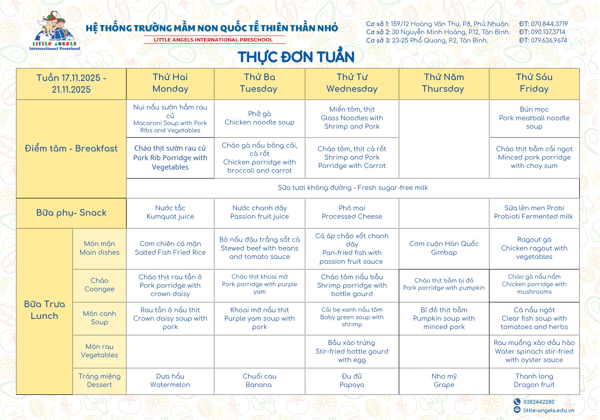 Nhà Trường xin gửi đến Quý Phụ huynh thực đơn các bữa ăn trong tuần dành cho các bé. Thực đơn được xây dựng đảm bảo đầy đủ dinh dưỡng, phù hợp với độ tuổi và mùa trong năm, giúp bé ăn ngon miệng và phát triển khỏe mạnh.