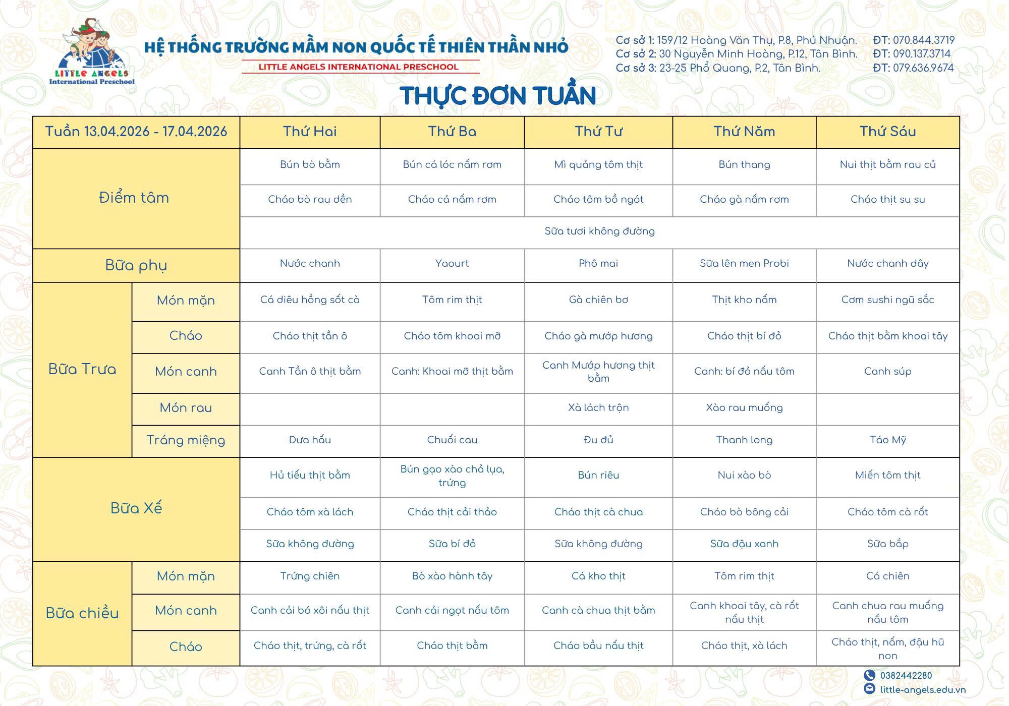 Nhà Trường xin gửi đến Quý Phụ huynh thực đơn các bữa ăn trong tuần dành cho các bé. Thực đơn được xây dựng đảm bảo đầy đủ dinh dưỡng, phù hợp với độ tuổi và mùa trong năm, giúp bé ăn ngon miệng và phát triển khỏe mạnh.