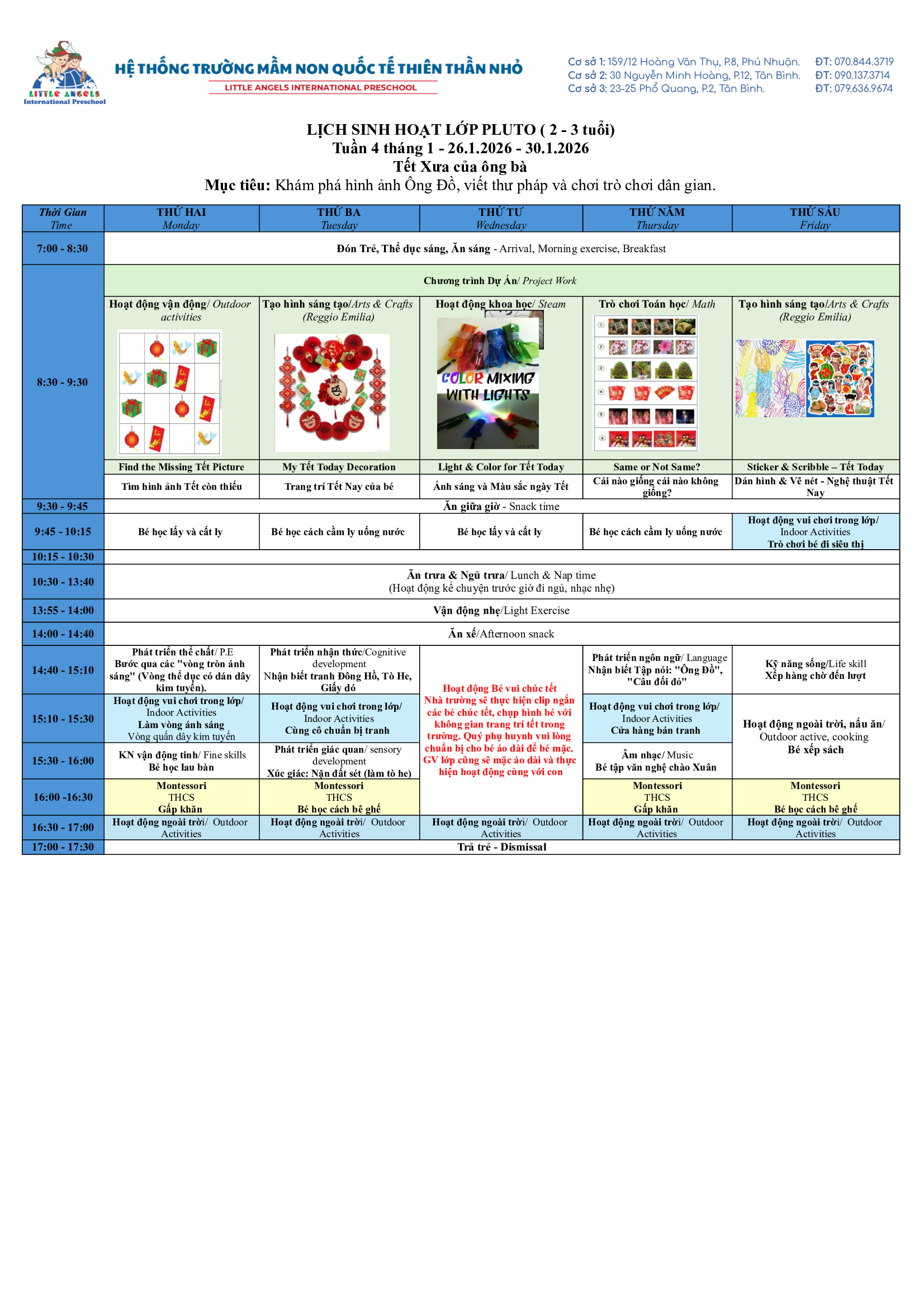 Trường Mầm Non Quốc Tế Thiên Thần Nhỏ xin trân trọng gửi đến ba mẹ kế hoạch hoạt động tuần [26 – 30/01/2026] của các bé.