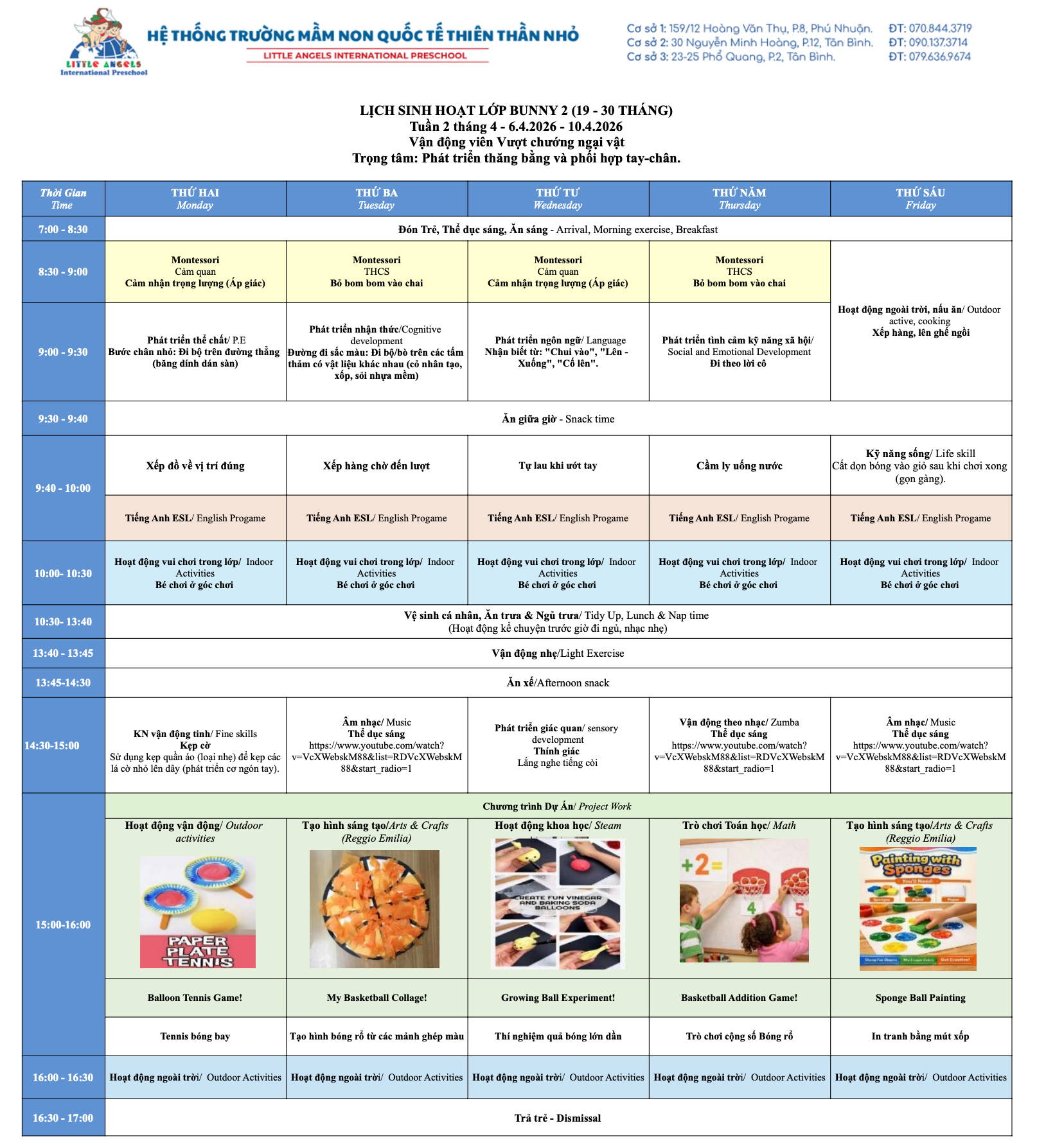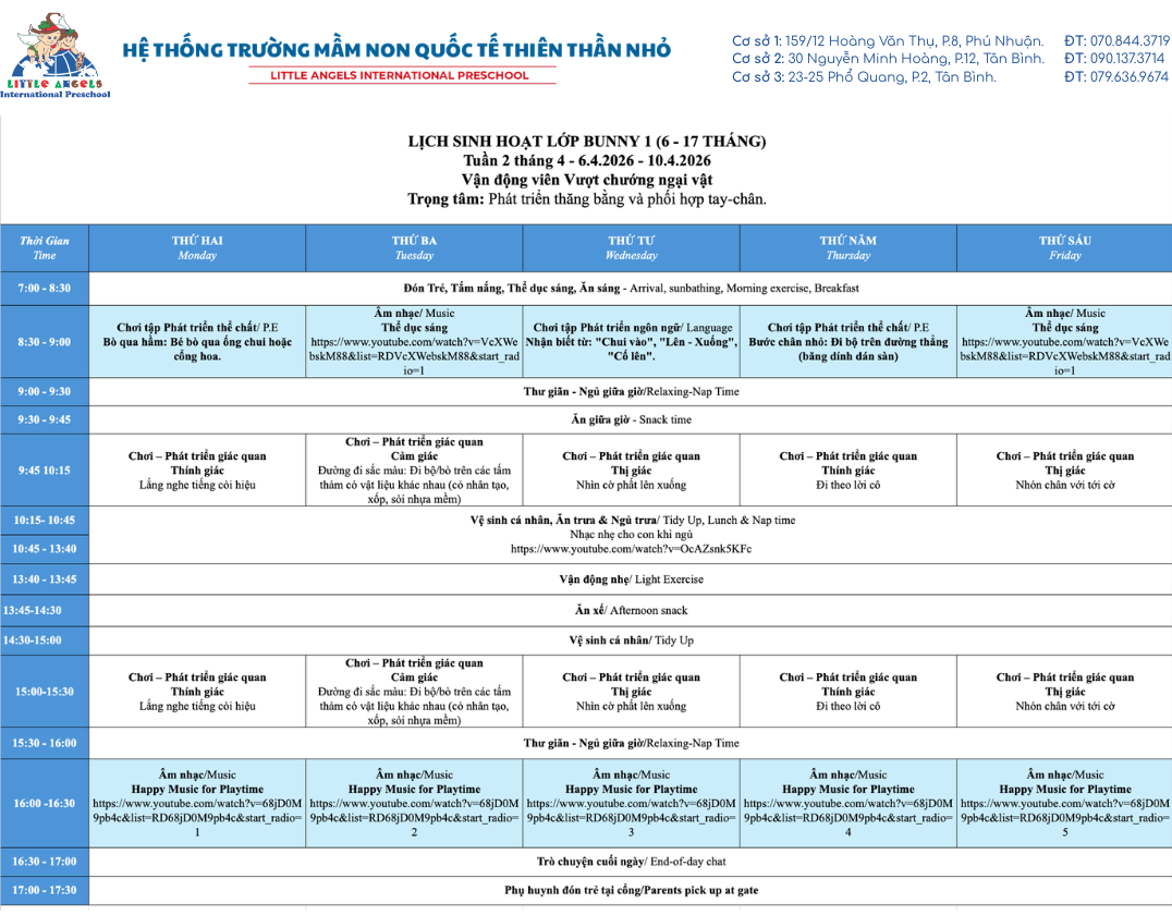 Trường Mầm Non Quốc Tế Thiên Thần Nhỏ xin trân trọng gửi đến ba mẹ kế hoạch hoạt động tuần [06/04 – 10/04/2026] của các bé.