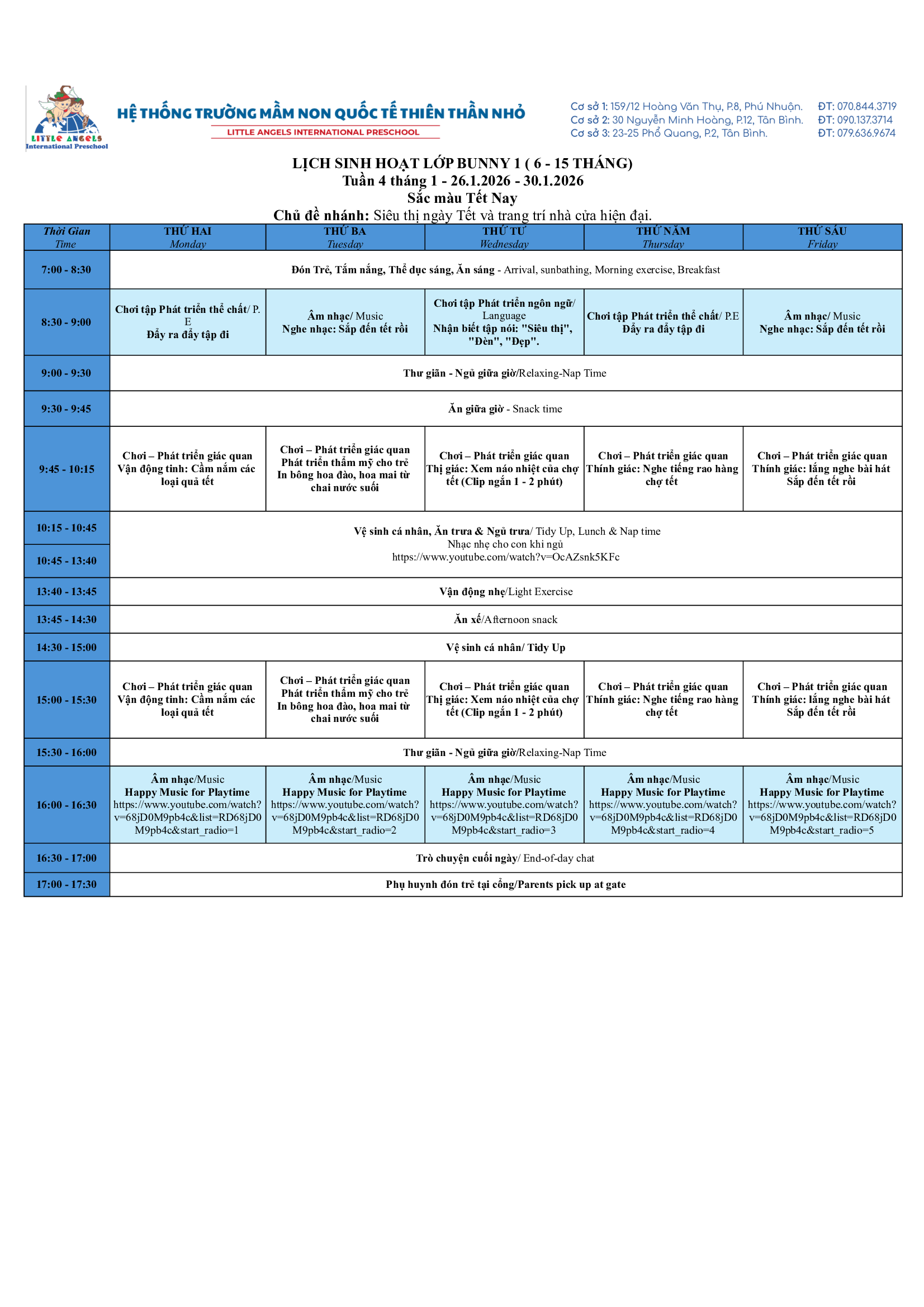 Trường Mầm Non Quốc Tế Thiên Thần Nhỏ xin trân trọng gửi đến ba mẹ kế hoạch hoạt động tuần [26 – 30/01/2026] của các bé.
