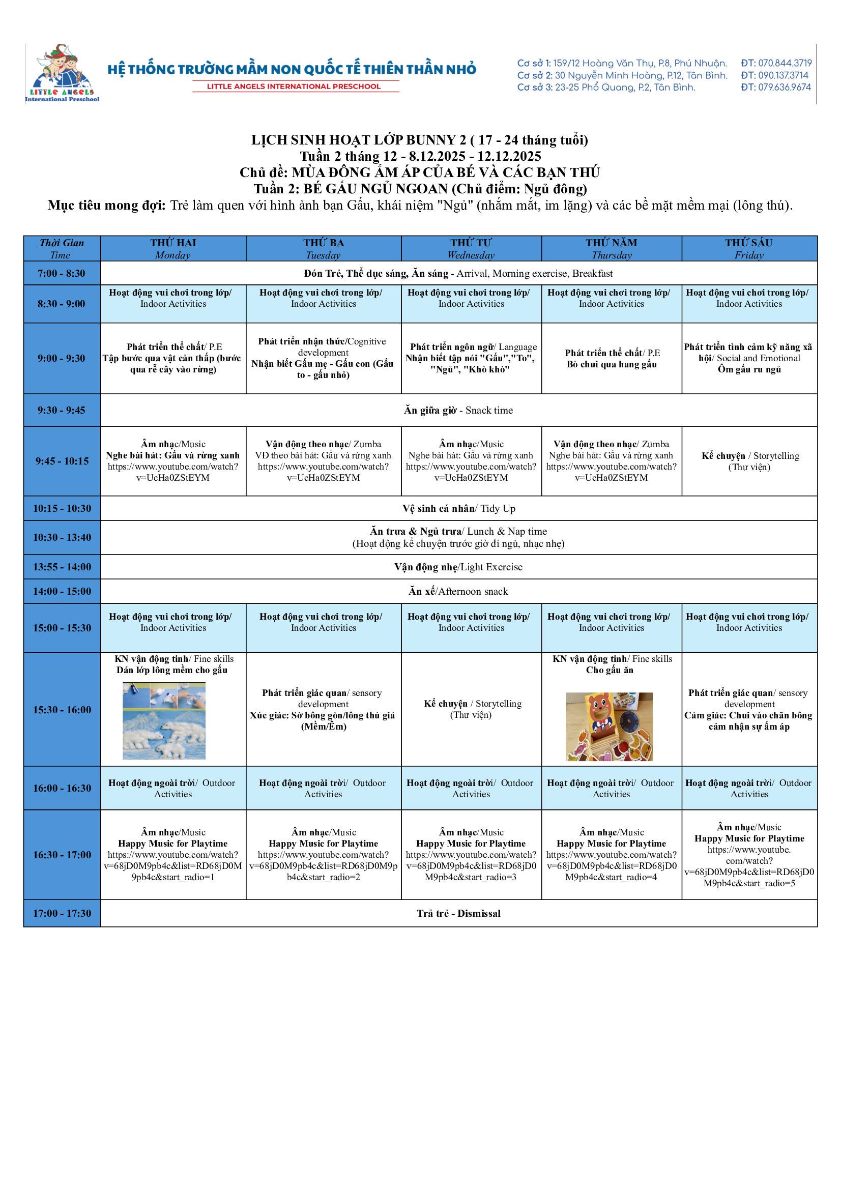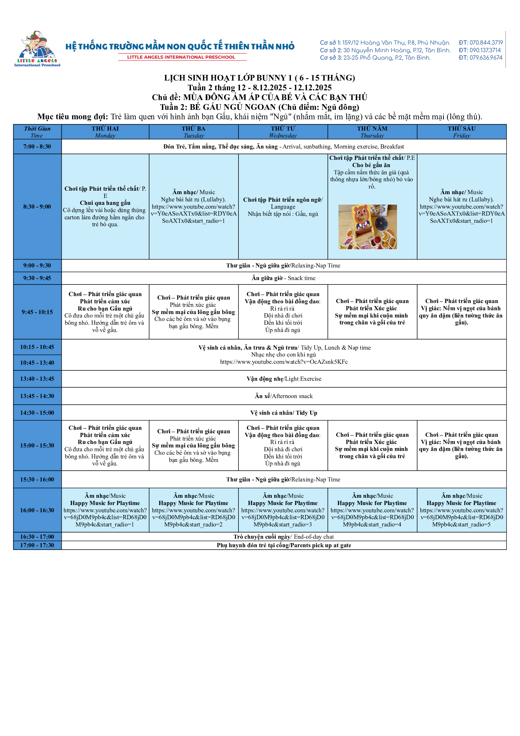 Trường Mầm Non Quốc Tế Thiên Thần Nhỏ xin trân trọng gửi đến ba mẹ kế hoạch hoạt động tuần [08-12/12/2025] của các bé.