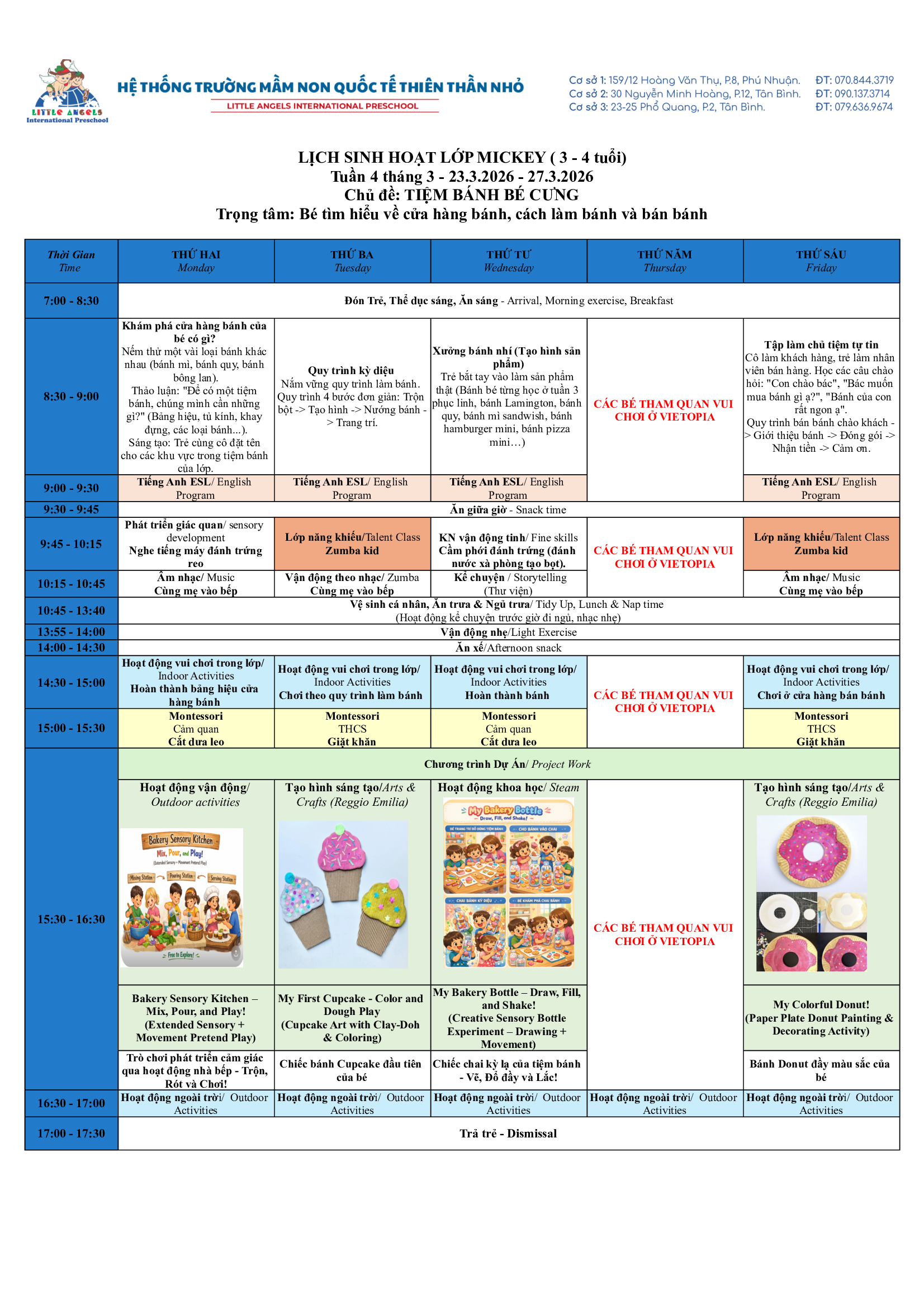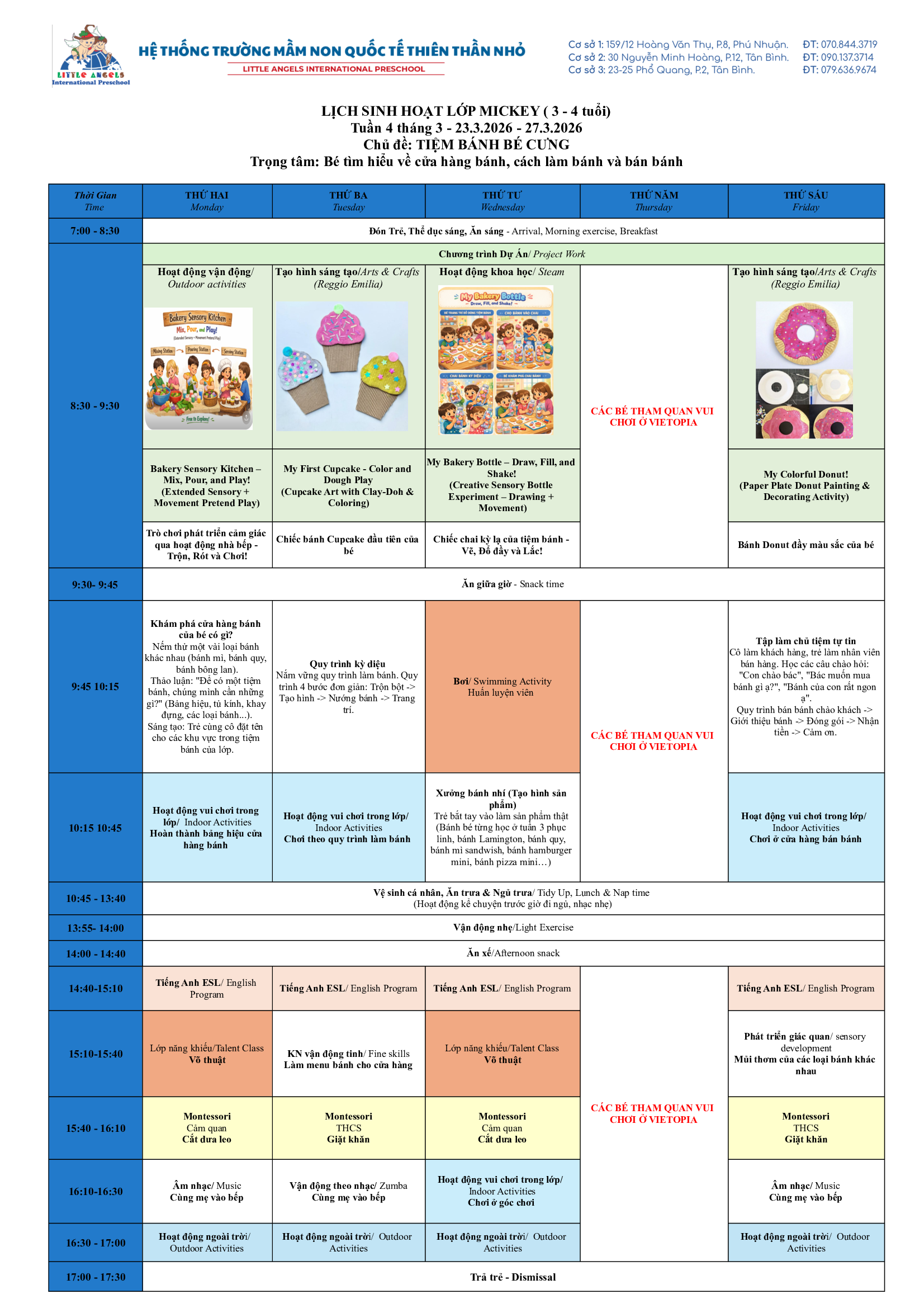 Trường Mầm Non Quốc Tế Thiên Thần Nhỏ xin trân trọng gửi đến ba mẹ kế hoạch hoạt động tuần [23 – 27/3/2026] của các bé.