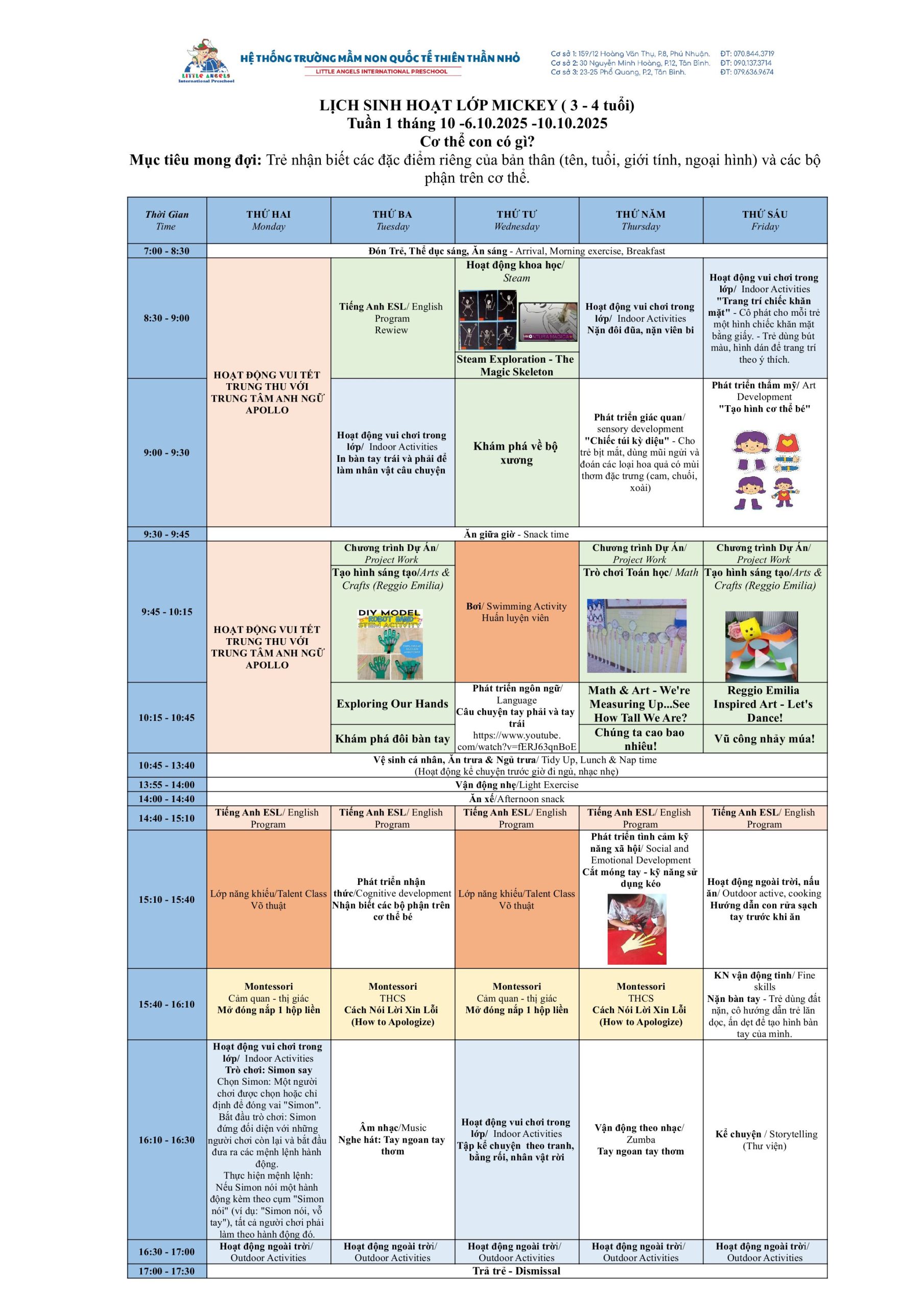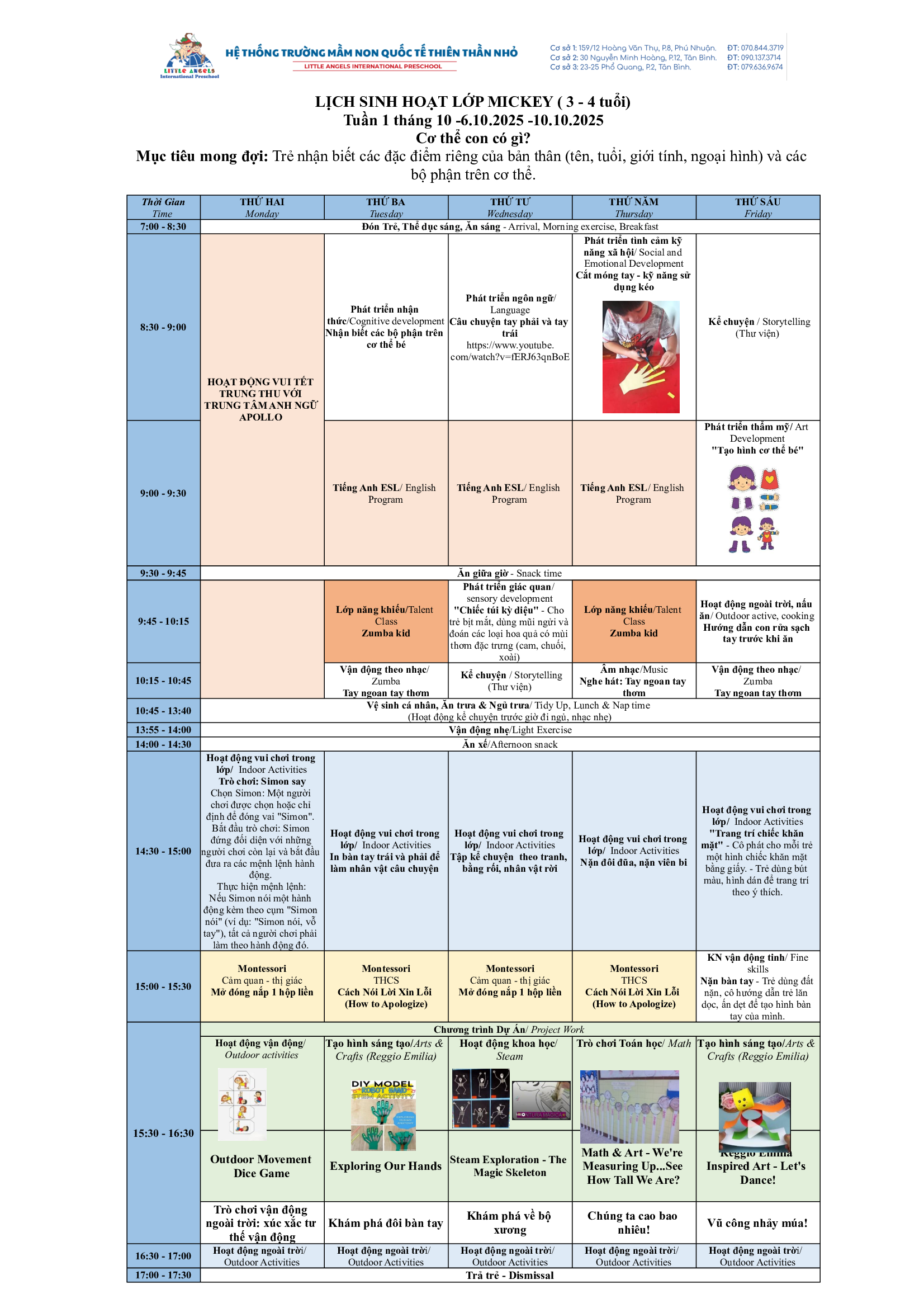 KẾ HOẠCH TUẦN 1 THÁNG 10 LỚP MICKEY (3 – 4 TUỔI)