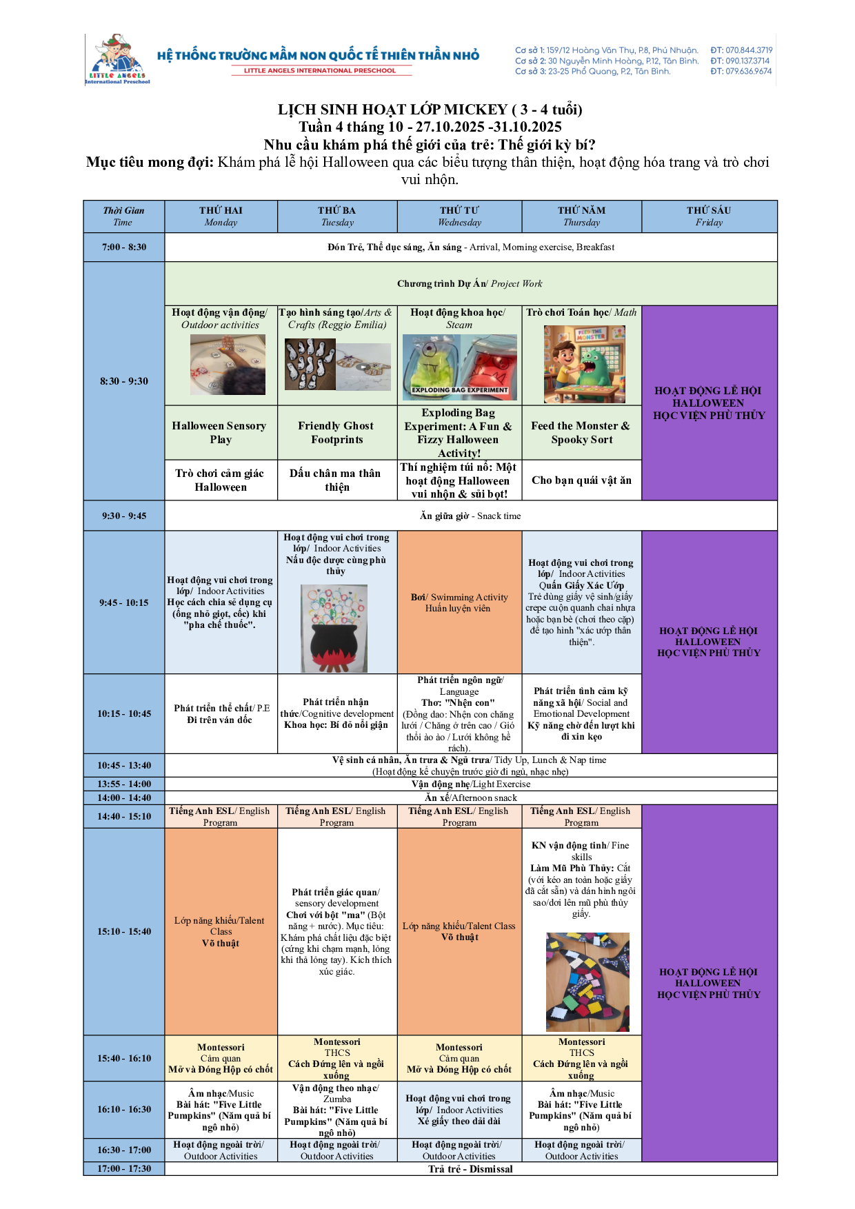 Trường Mầm Non Quốc Tế Thiên Thần Nhỏ xin trân trọng gửi đến ba mẹ kế hoạch hoạt động tuần [27 – 31/10/2025] của các bé.