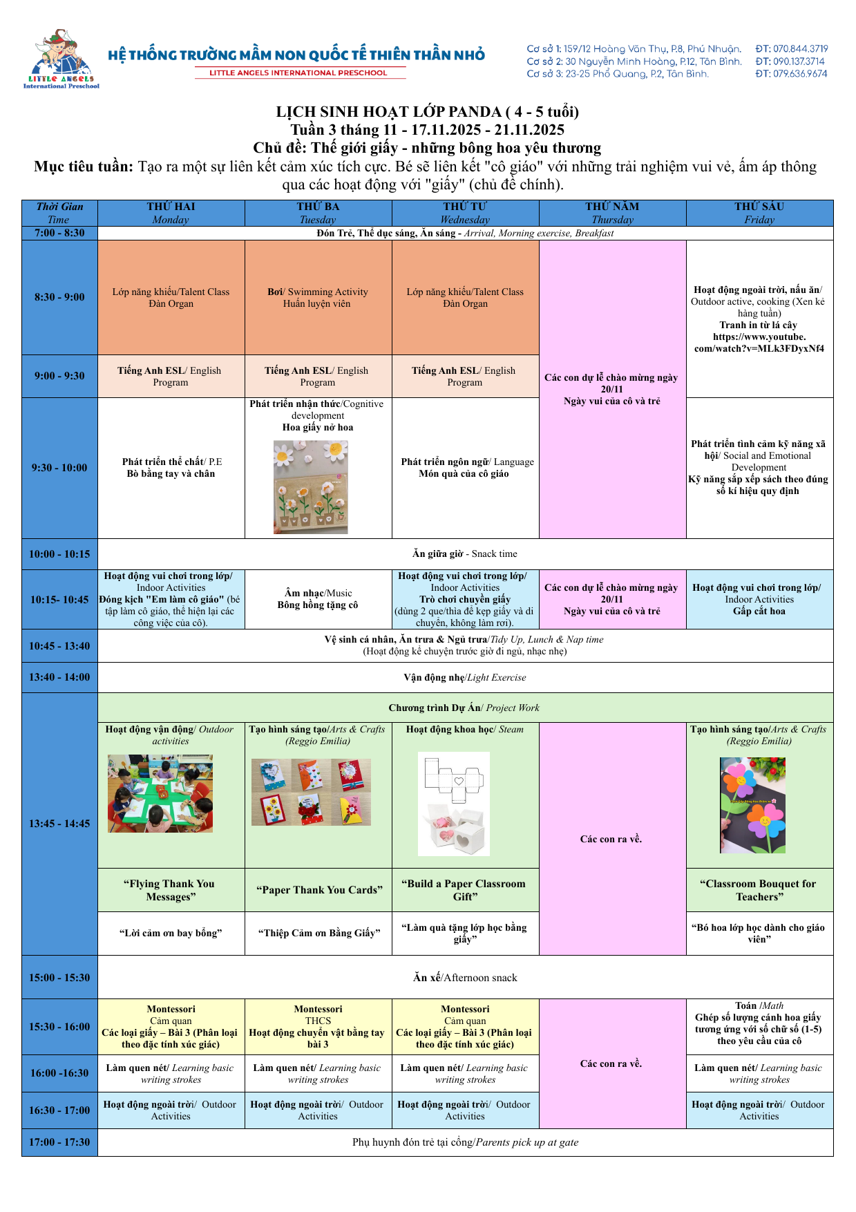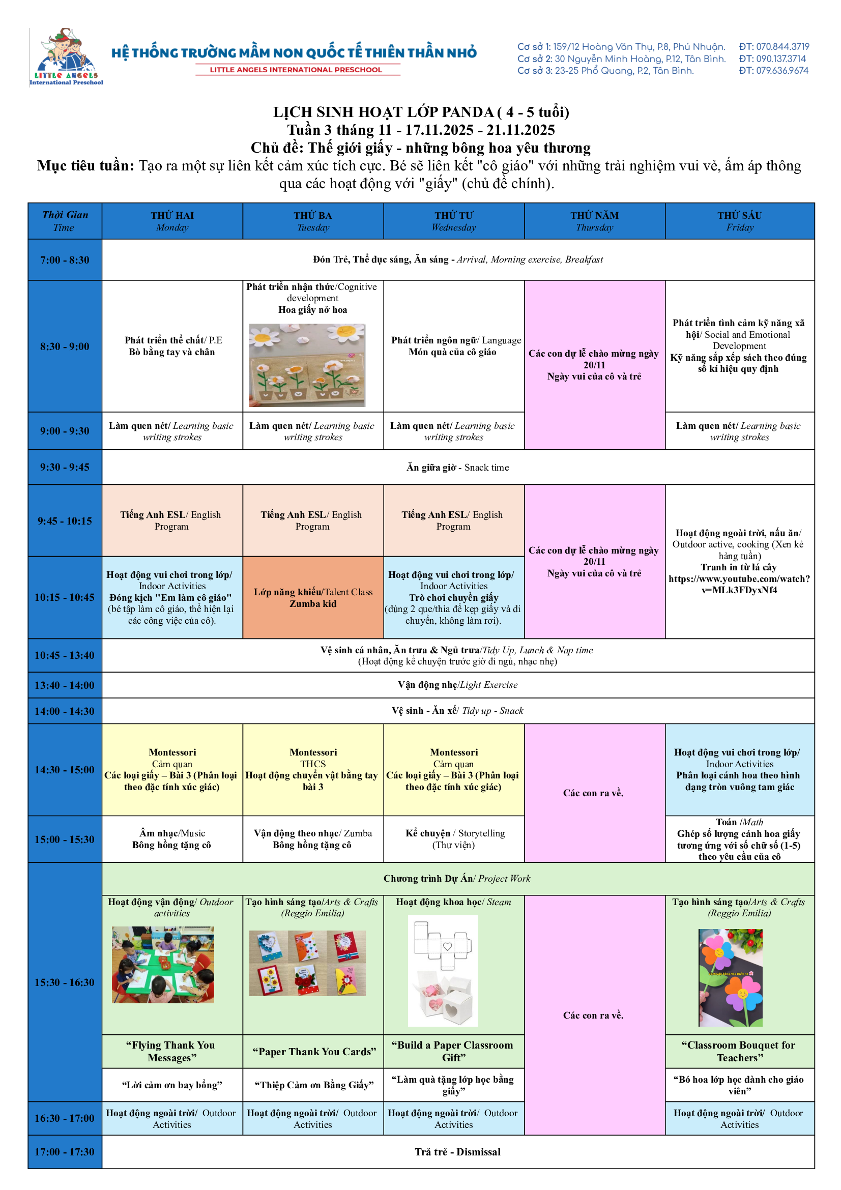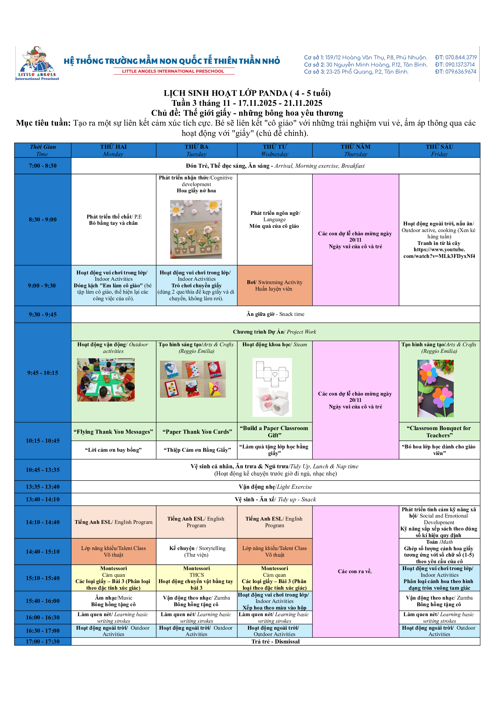 Trường Mầm Non Quốc Tế Thiên Thần Nhỏ xin trân trọng gửi đến ba mẹ kế hoạch hoạt động tuần [17-21/11/2025] của các bé
