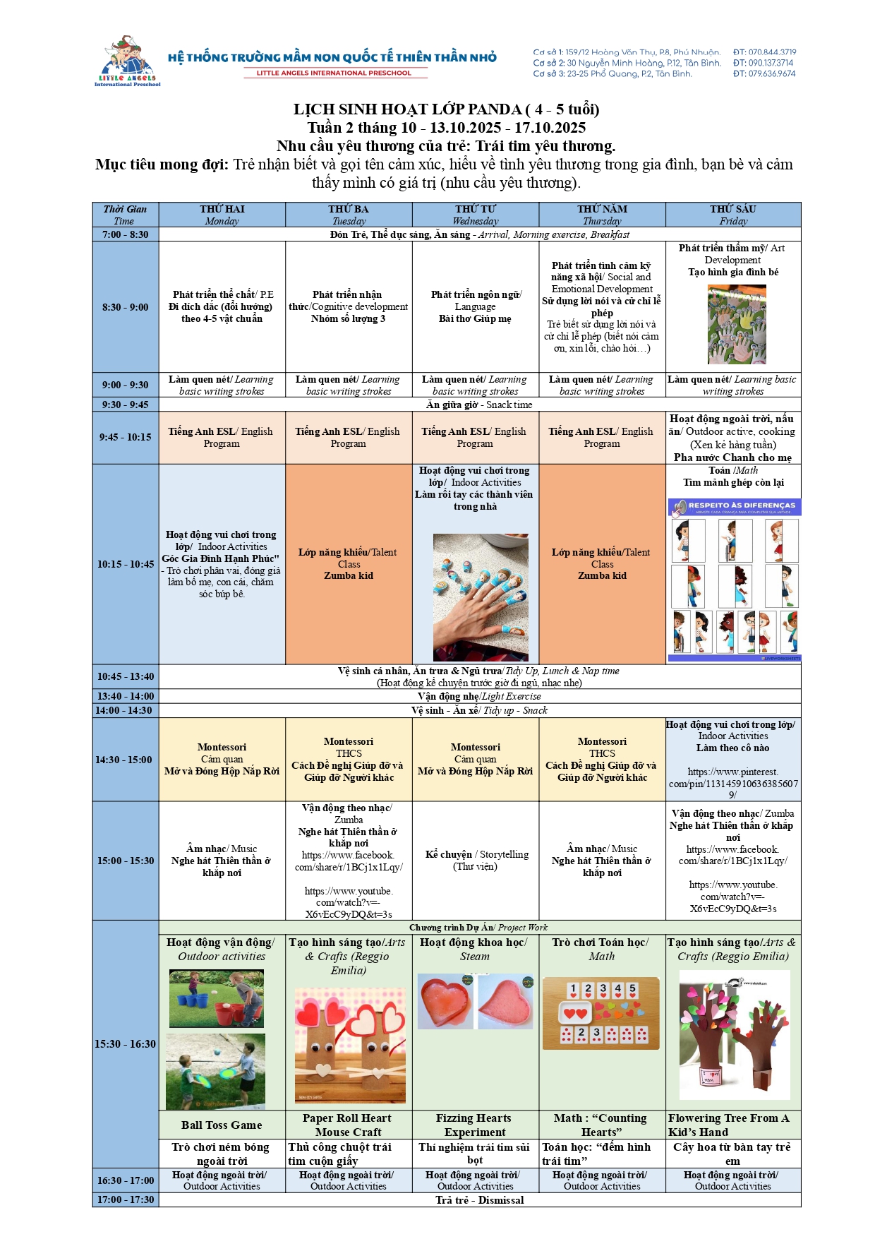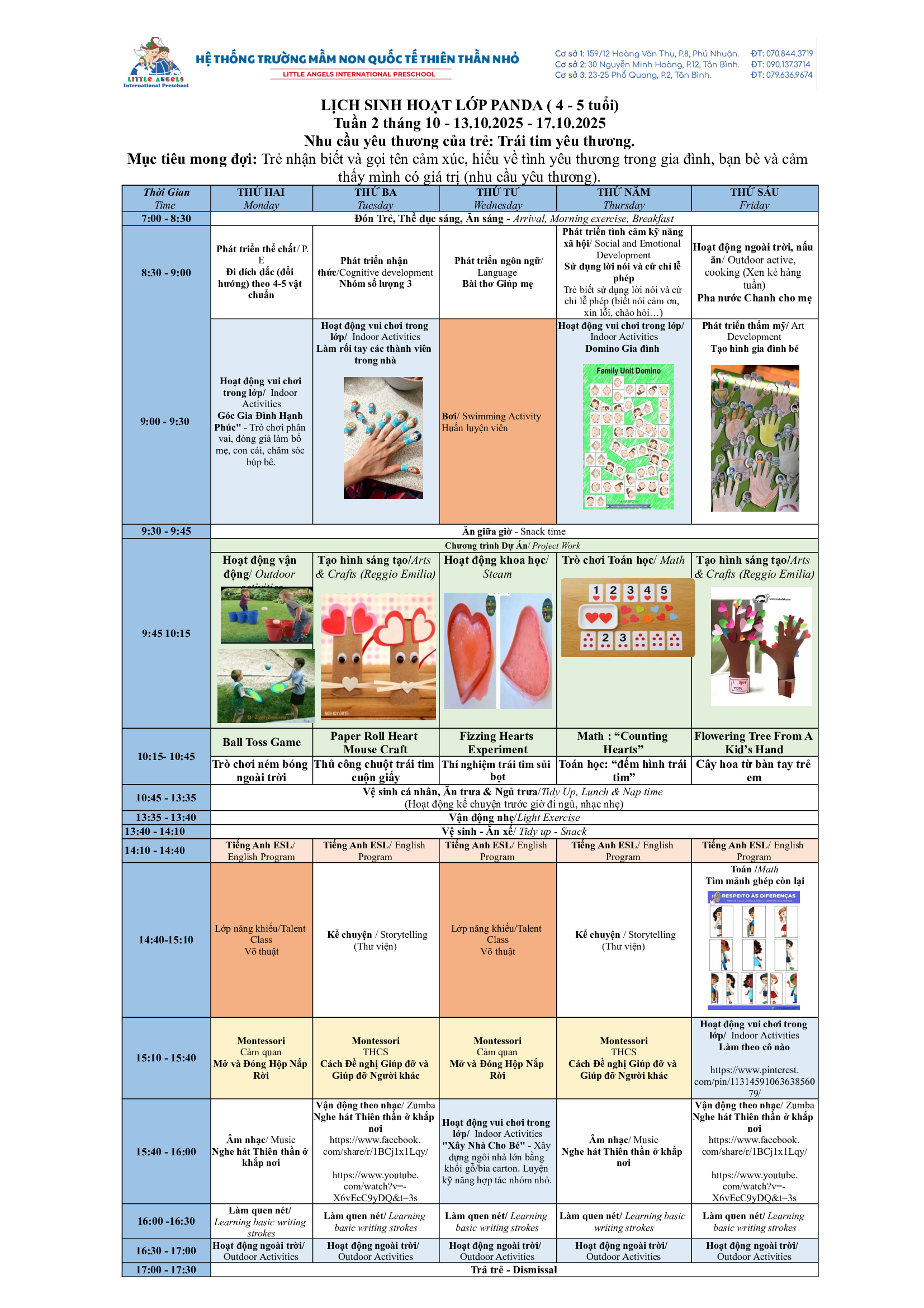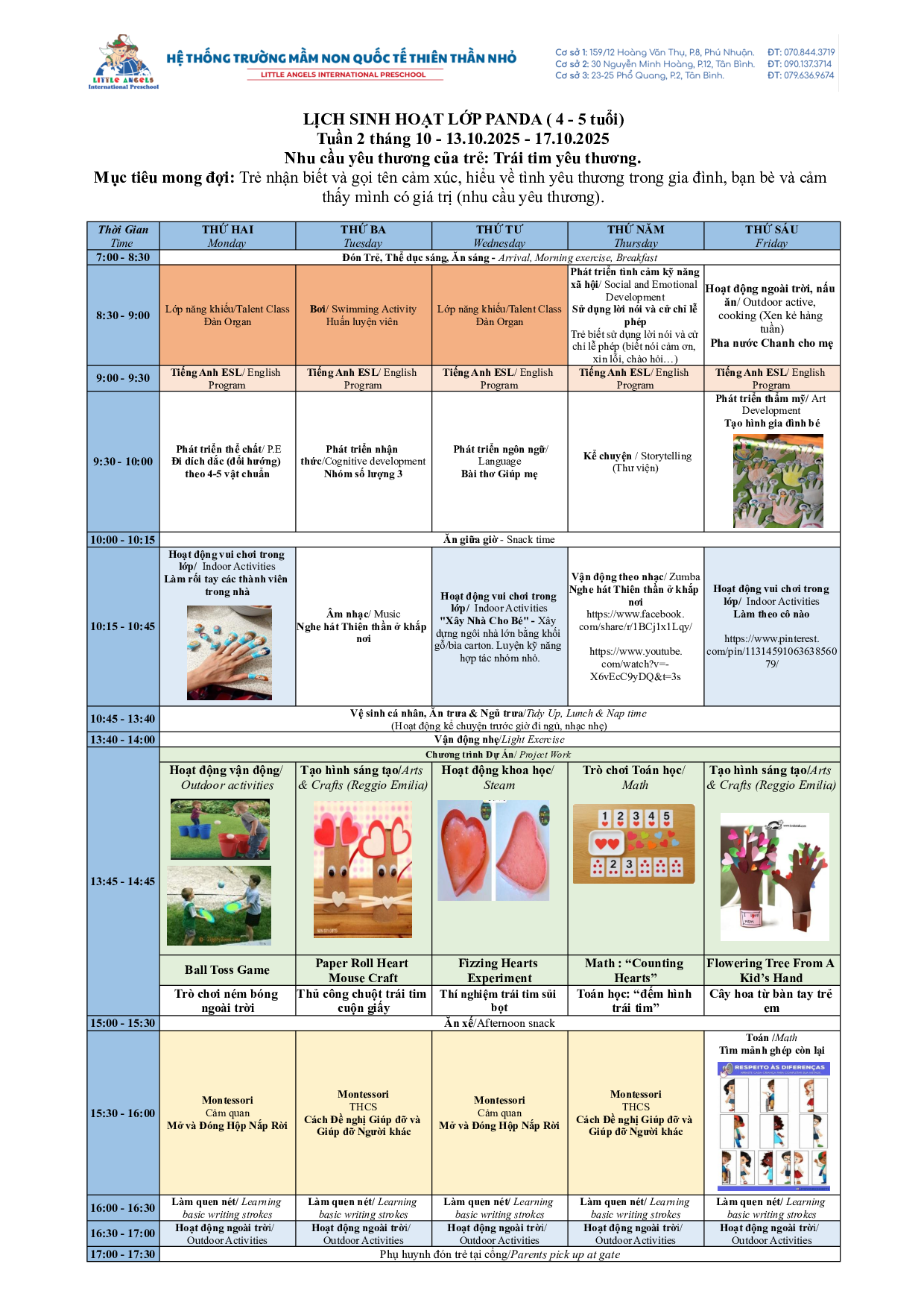 Trường Mầm Non Quốc Tế Thiên Thần Nhỏ xin trân trọng gửi đến ba mẹ kế hoạch hoạt động tuần [13 – 17/10/2025] của các bé
