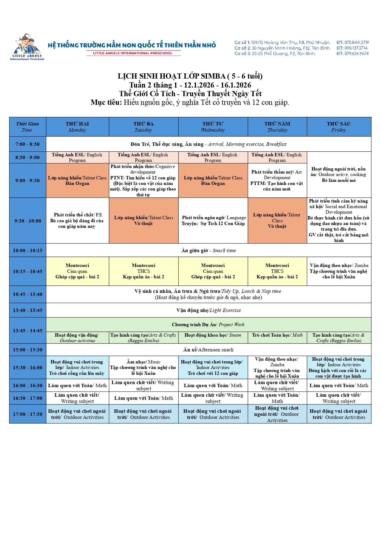 Trường Mầm Non Quốc Tế Thiên Thần Nhỏ xin trân trọng gửi đến ba mẹ kế hoạch hoạt động tuần [12 – 16/01/2026] của các bé