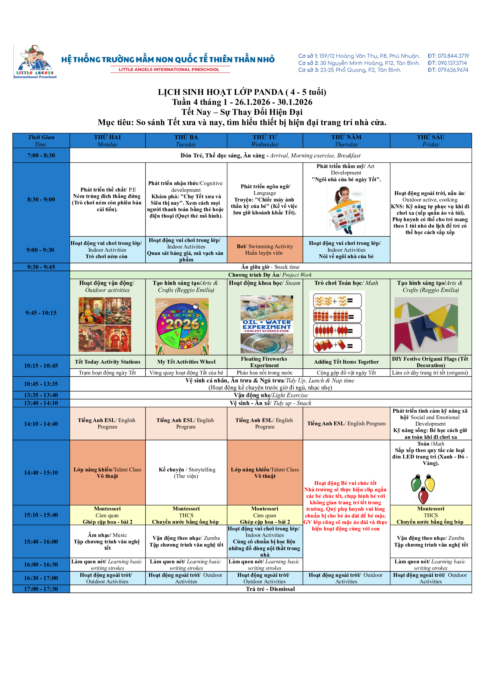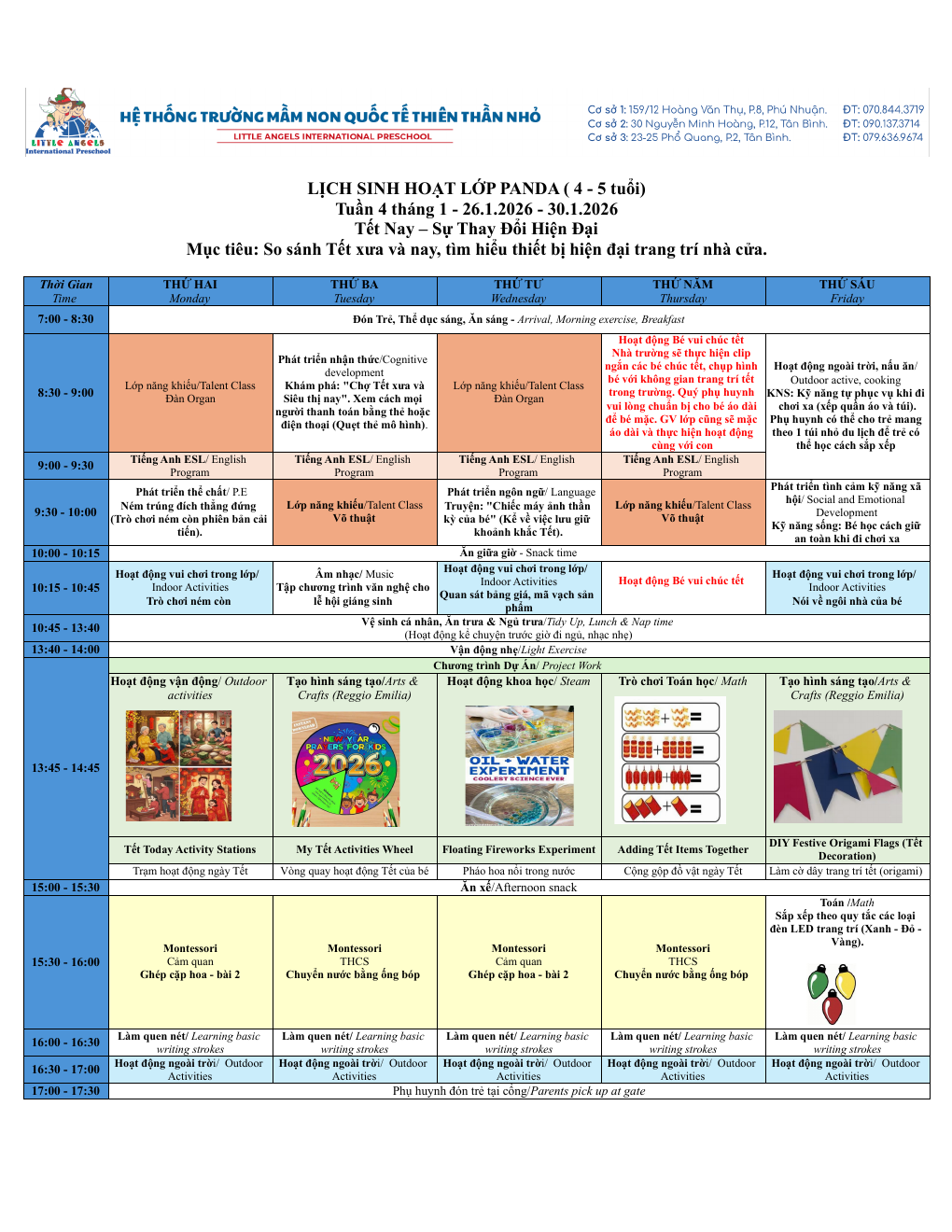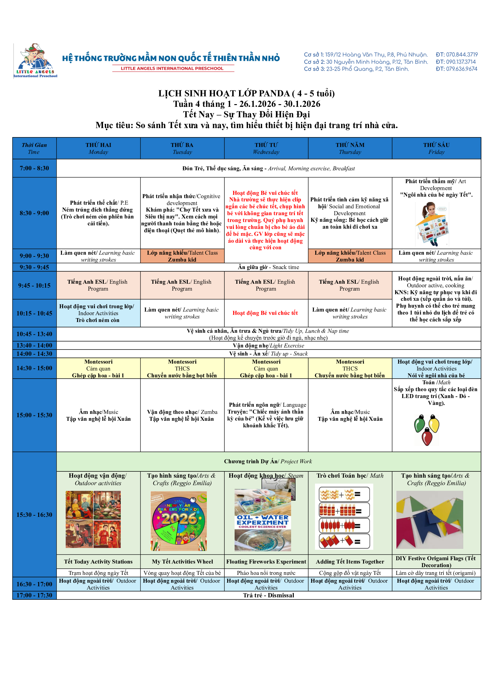Trường Mầm Non Quốc Tế Thiên Thần Nhỏ xin trân trọng gửi đến ba mẹ kế hoạch hoạt động tuần [26 – 30/01/2026] của các bé