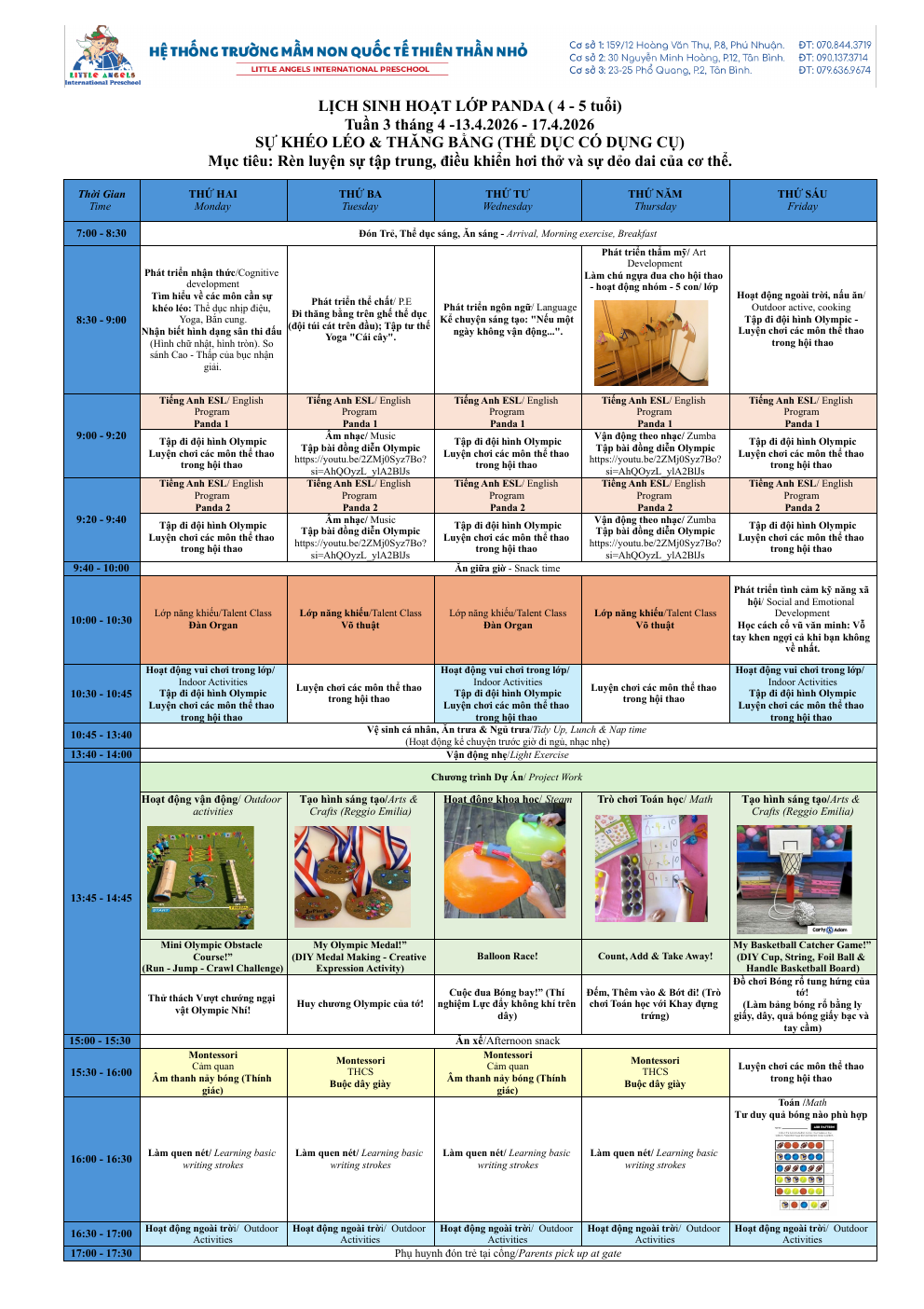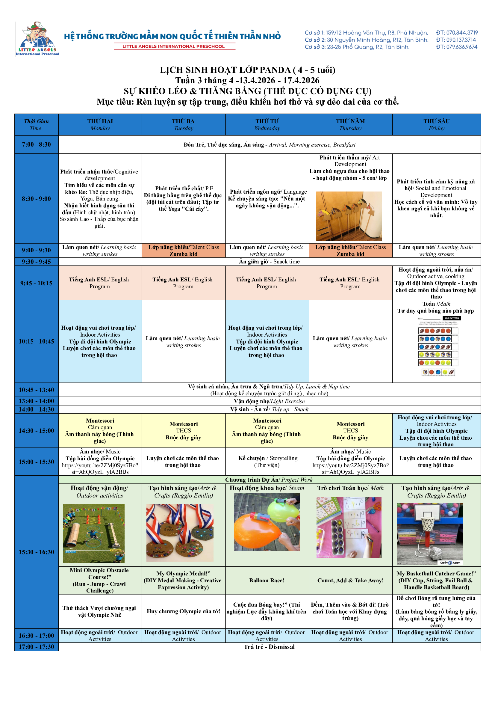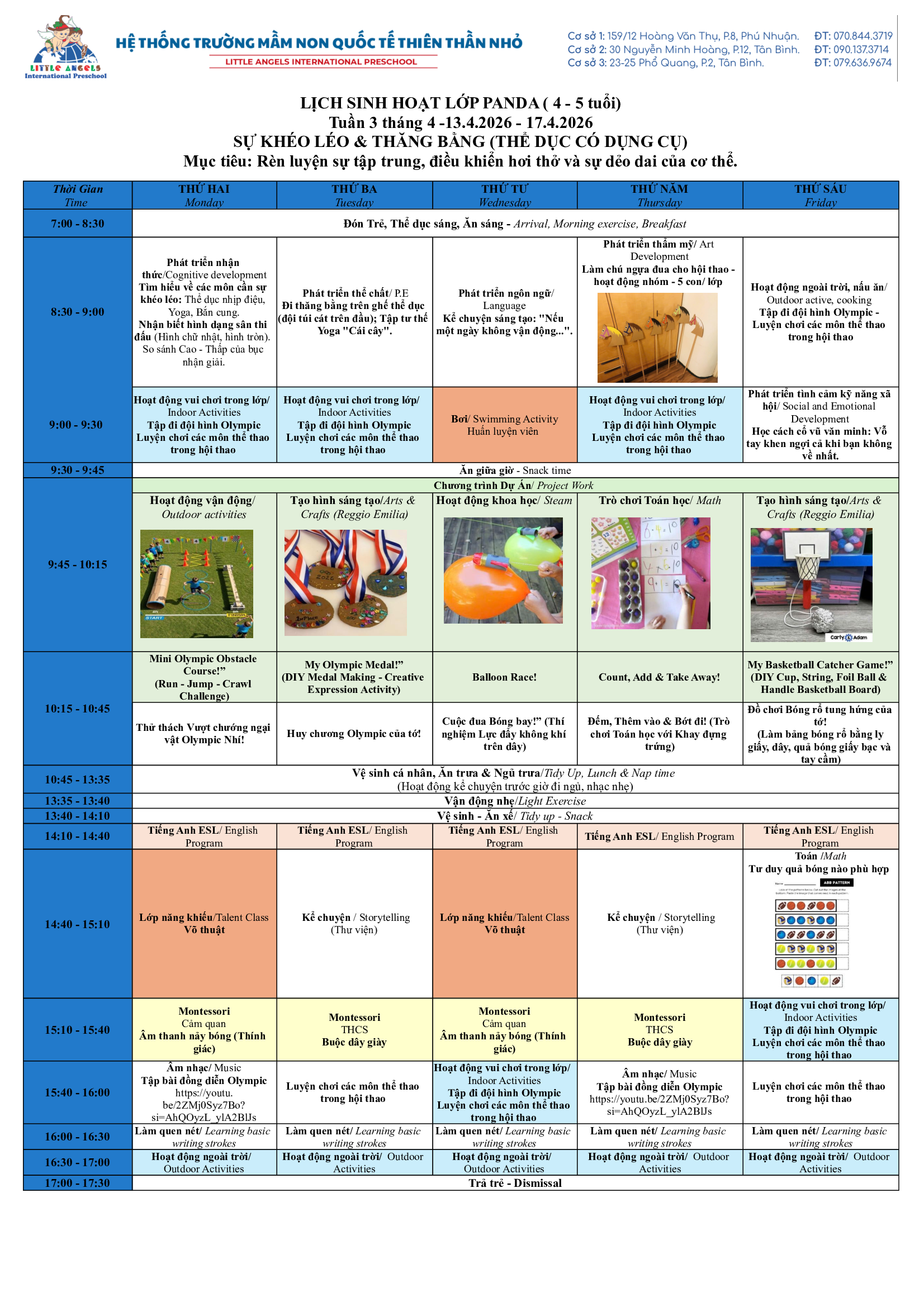 Trường Mầm Non Quốc Tế Thiên Thần Nhỏ xin trân trọng gửi đến ba mẹ kế hoạch hoạt động tuần [13/04 – 17/04/2026] của các bé