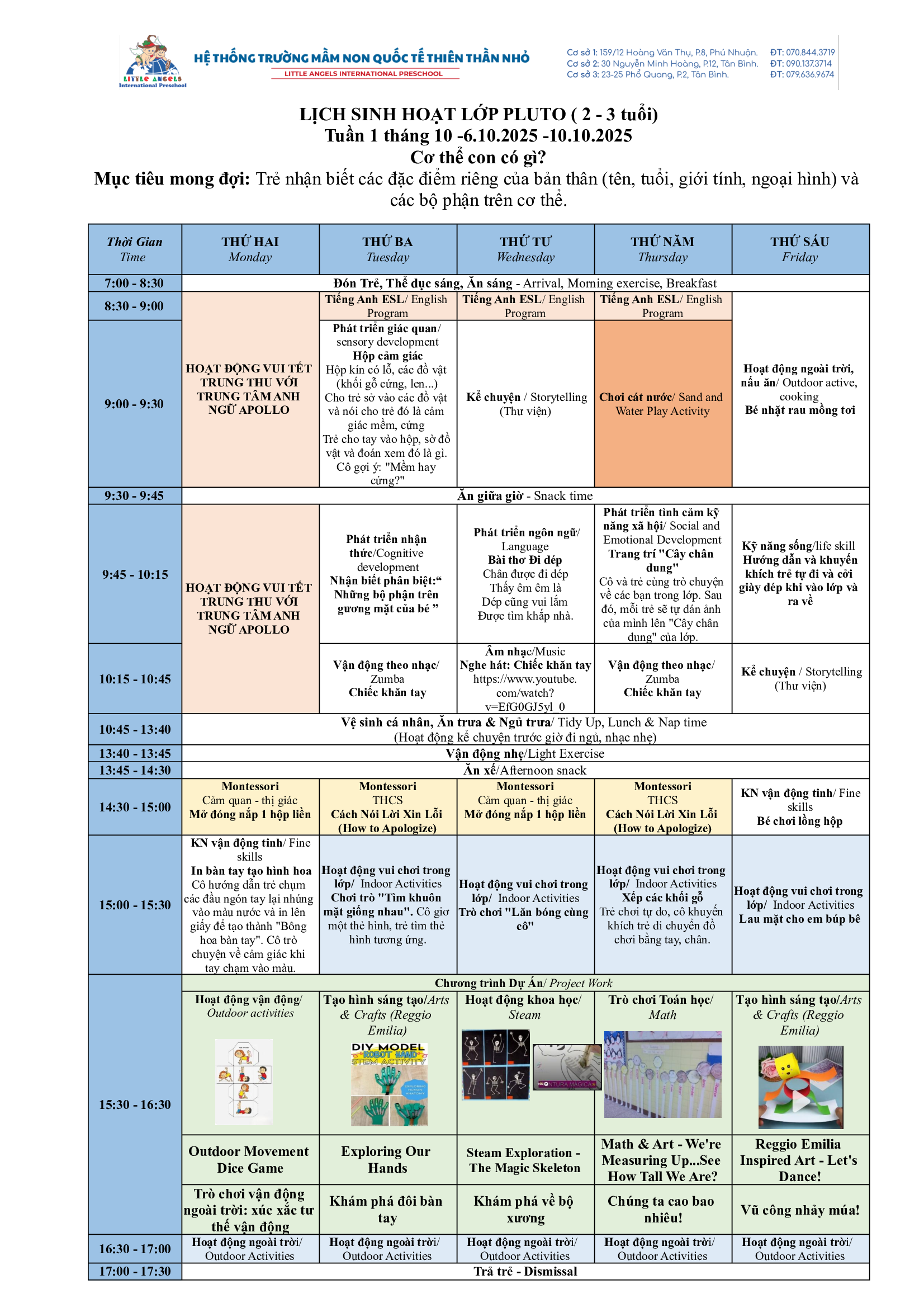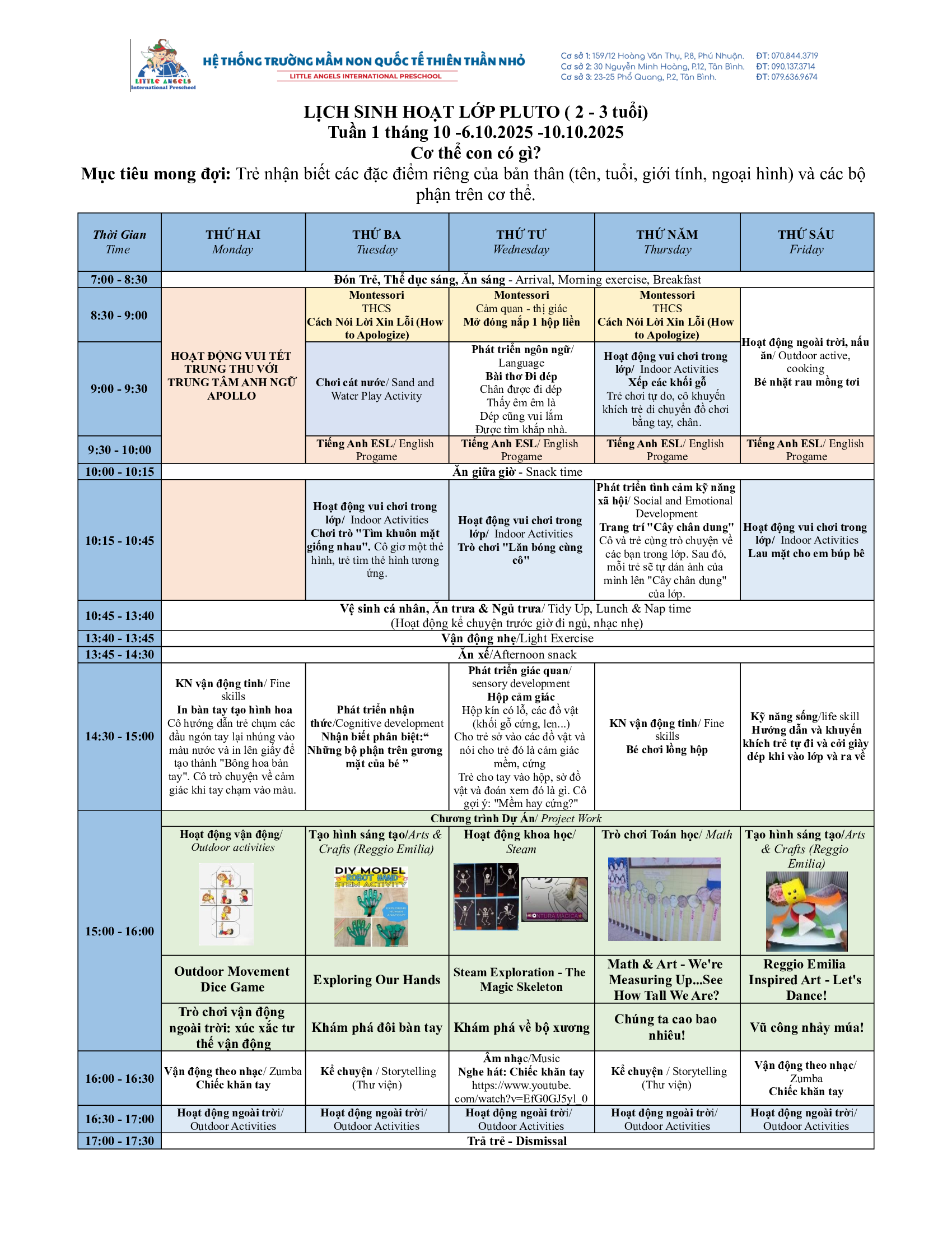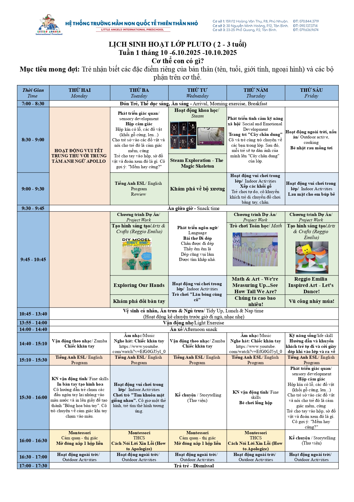 Trường Mầm Non Quốc Tế Thiên Thần Nhỏ xin trân trọng gửi đến ba mẹ kế hoạch hoạt động tuần [06 – 10/10/2025] của các bé.
