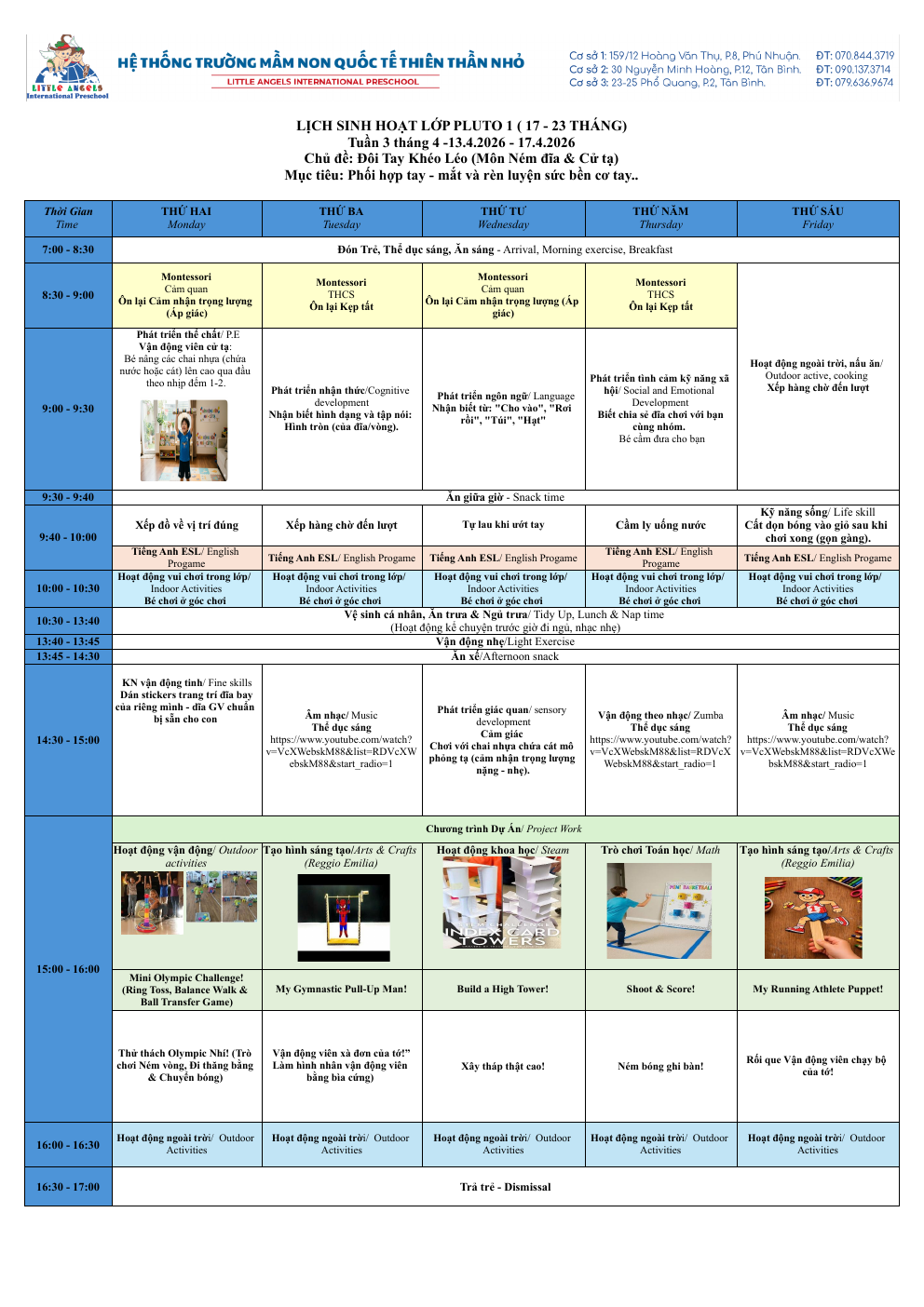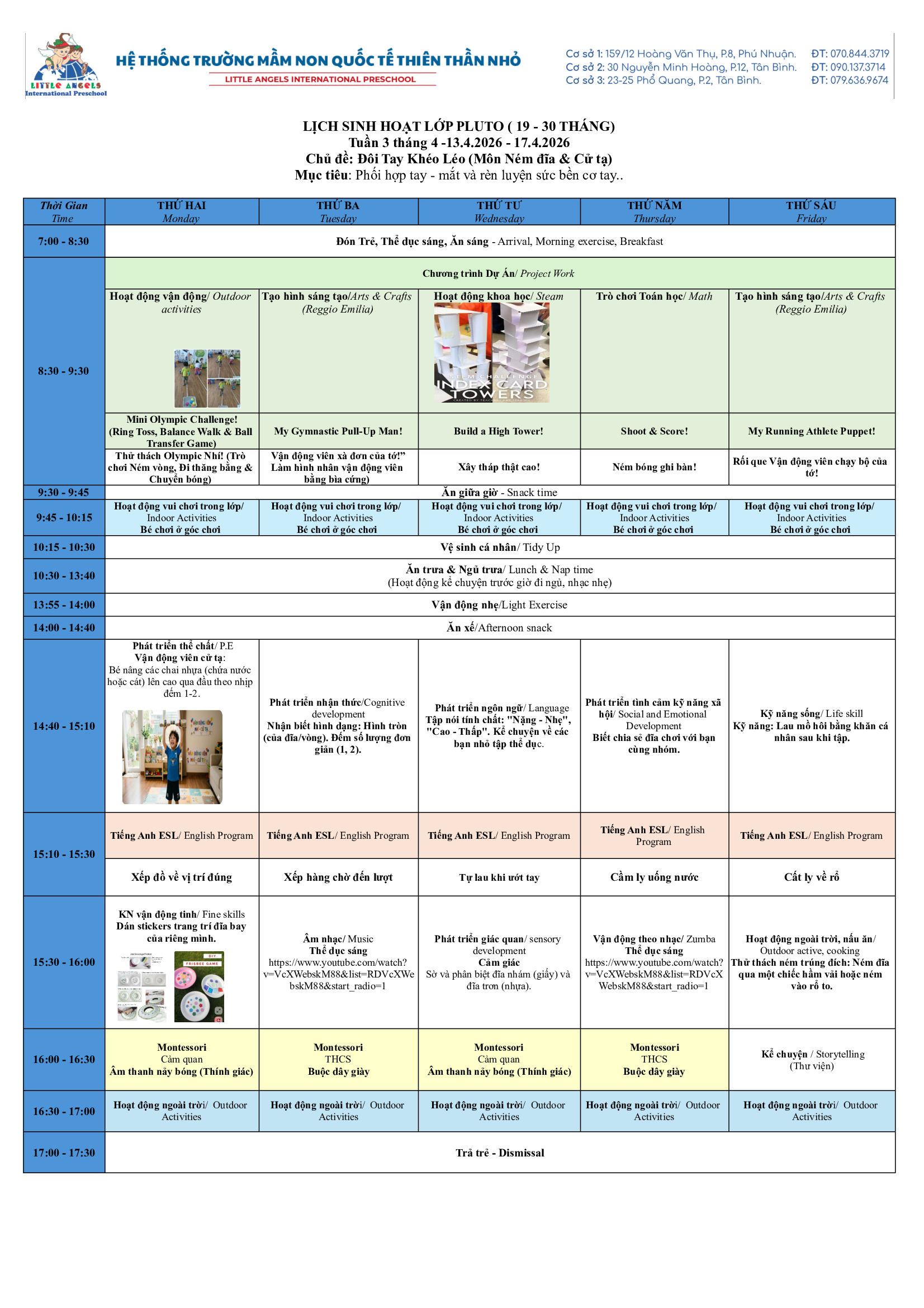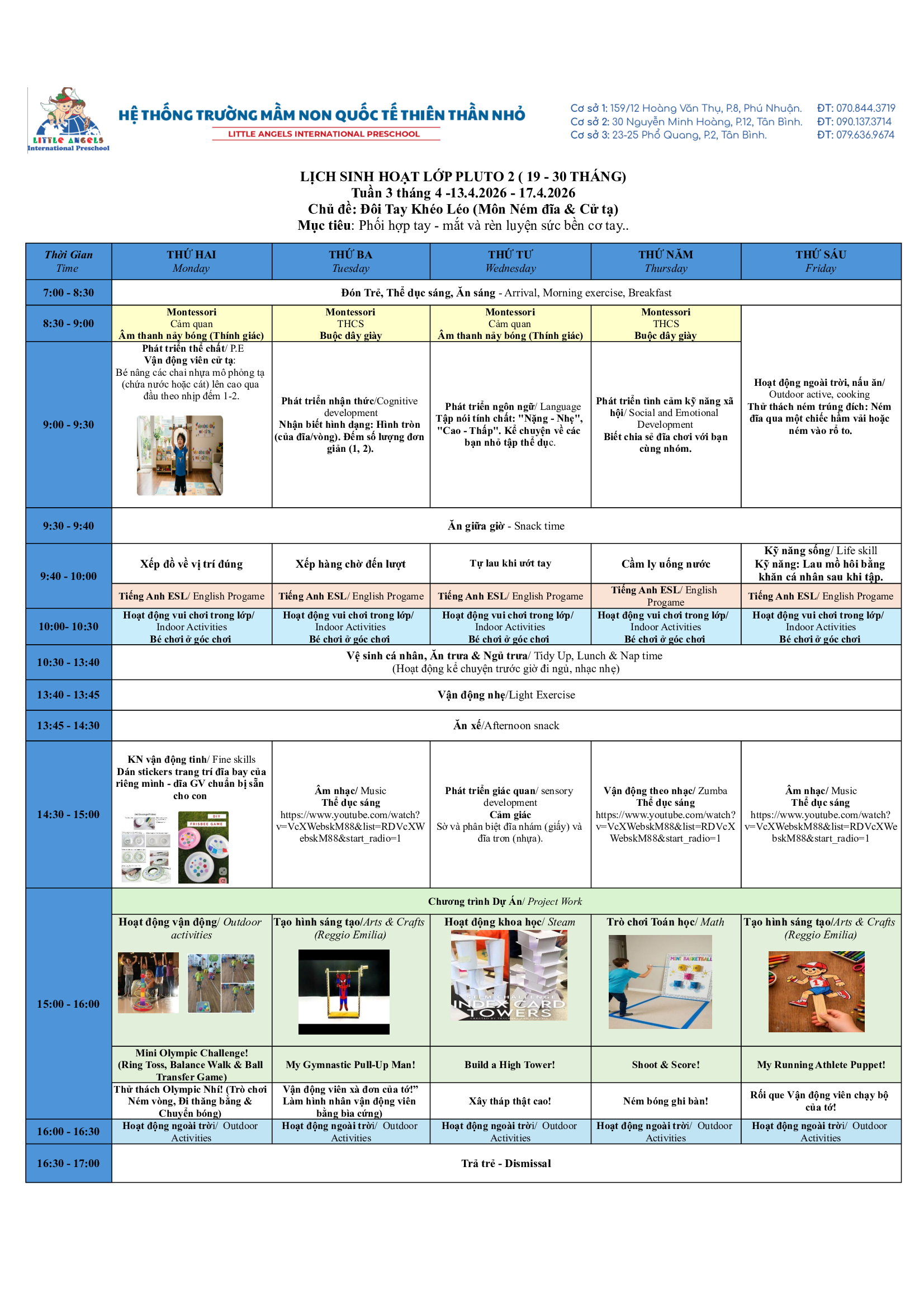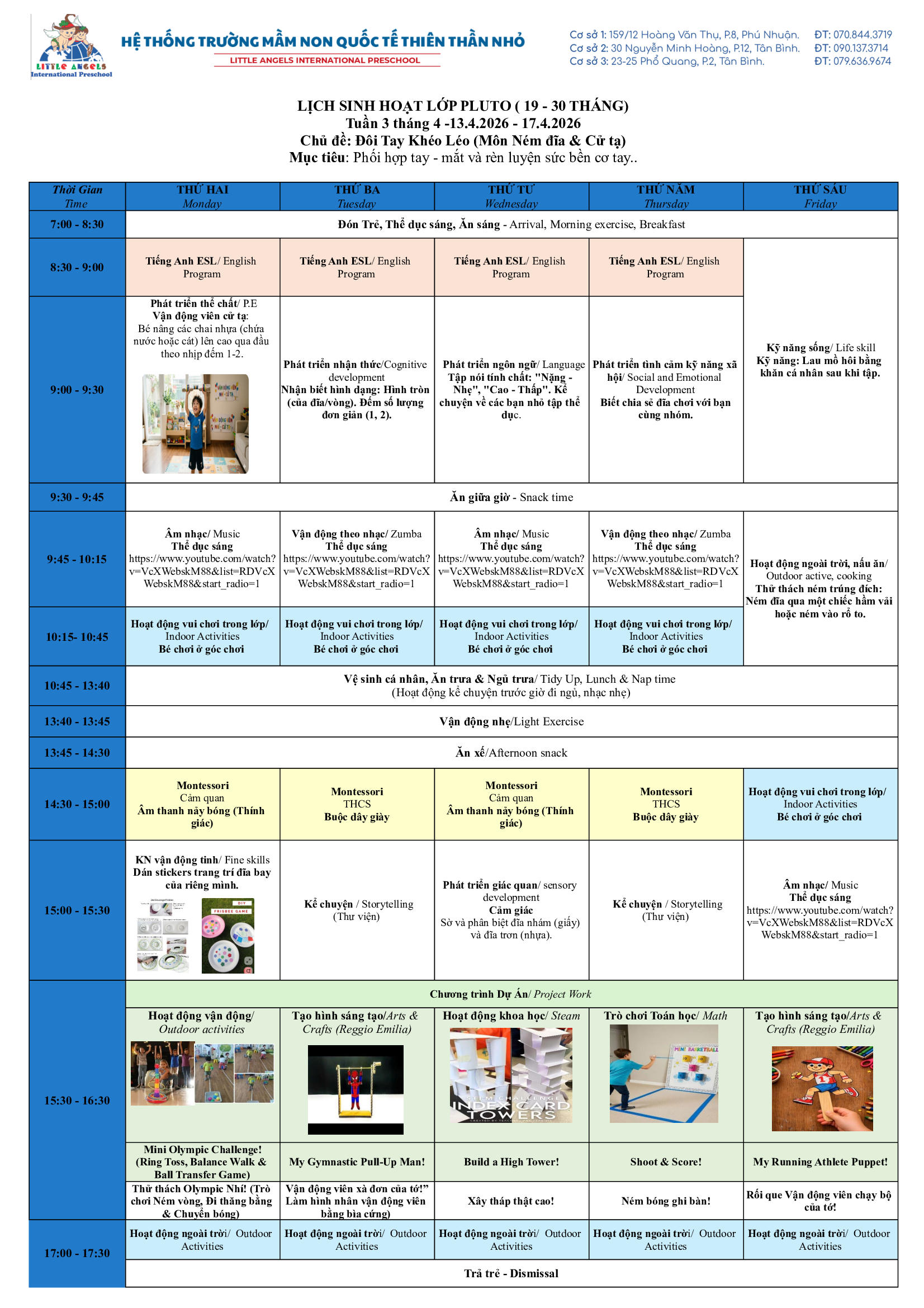 Trường Mầm Non Quốc Tế Thiên Thần Nhỏ xin trân trọng gửi đến ba mẹ kế hoạch hoạt động tuần [13/04 – 17/04/2026] của các bé.