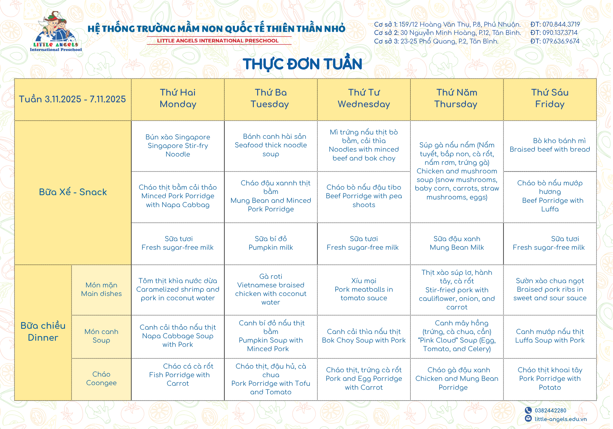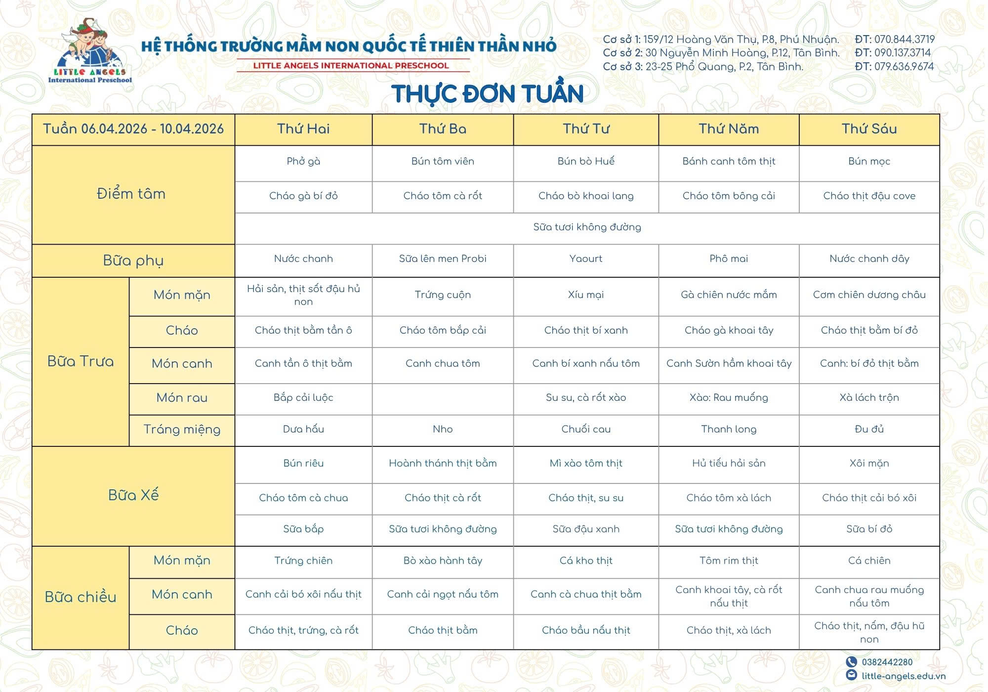 Nhà Trường xin gửi đến Quý Phụ huynh thực đơn các bữa ăn trong tuần dành cho các bé. Thực đơn được xây dựng đảm bảo đầy đủ dinh dưỡng, phù hợp với độ tuổi và mùa trong năm, giúp bé ăn ngon miệng và phát triển khỏe mạnh.