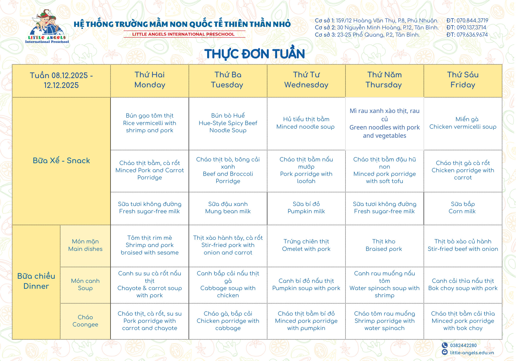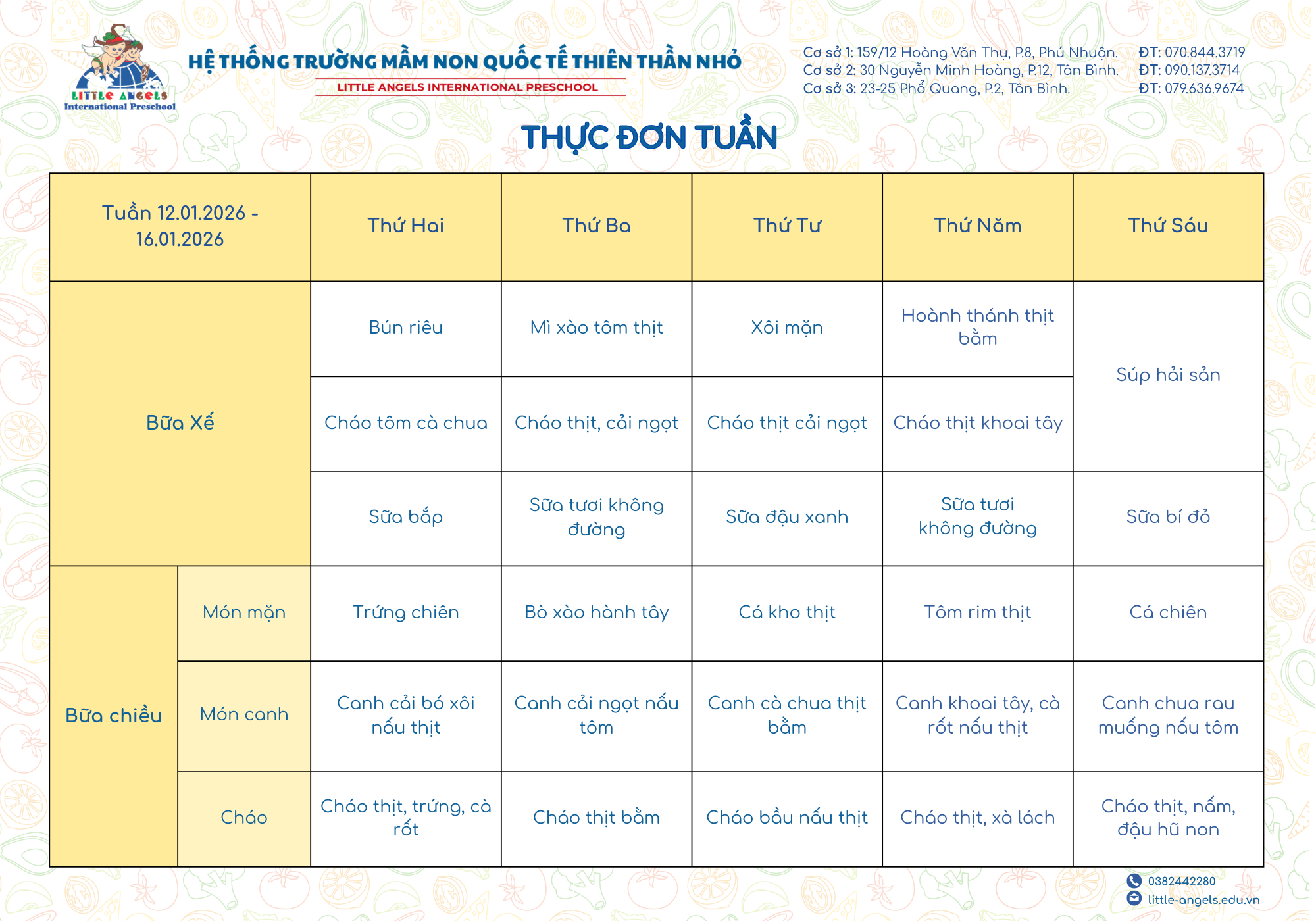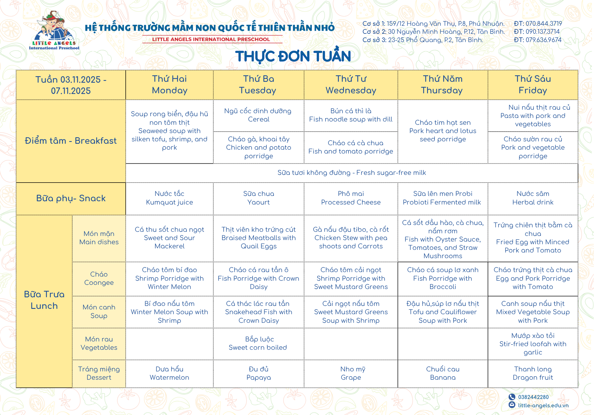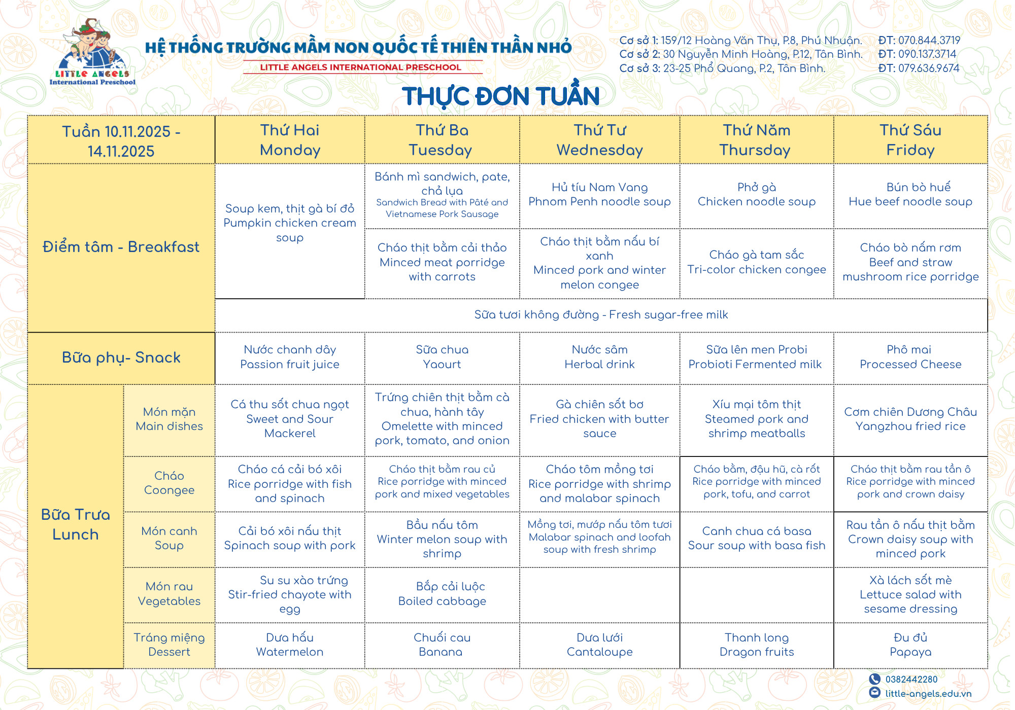Nhà Trường xin gửi đến Quý Phụ huynh thực đơn các bữa ăn trong tuần dành cho các bé. Thực đơn được xây dựng đảm bảo đầy đủ dinh dưỡng, phù hợp với độ tuổi và mùa trong năm, giúp bé ăn ngon miệng và phát triển khỏe mạnh.