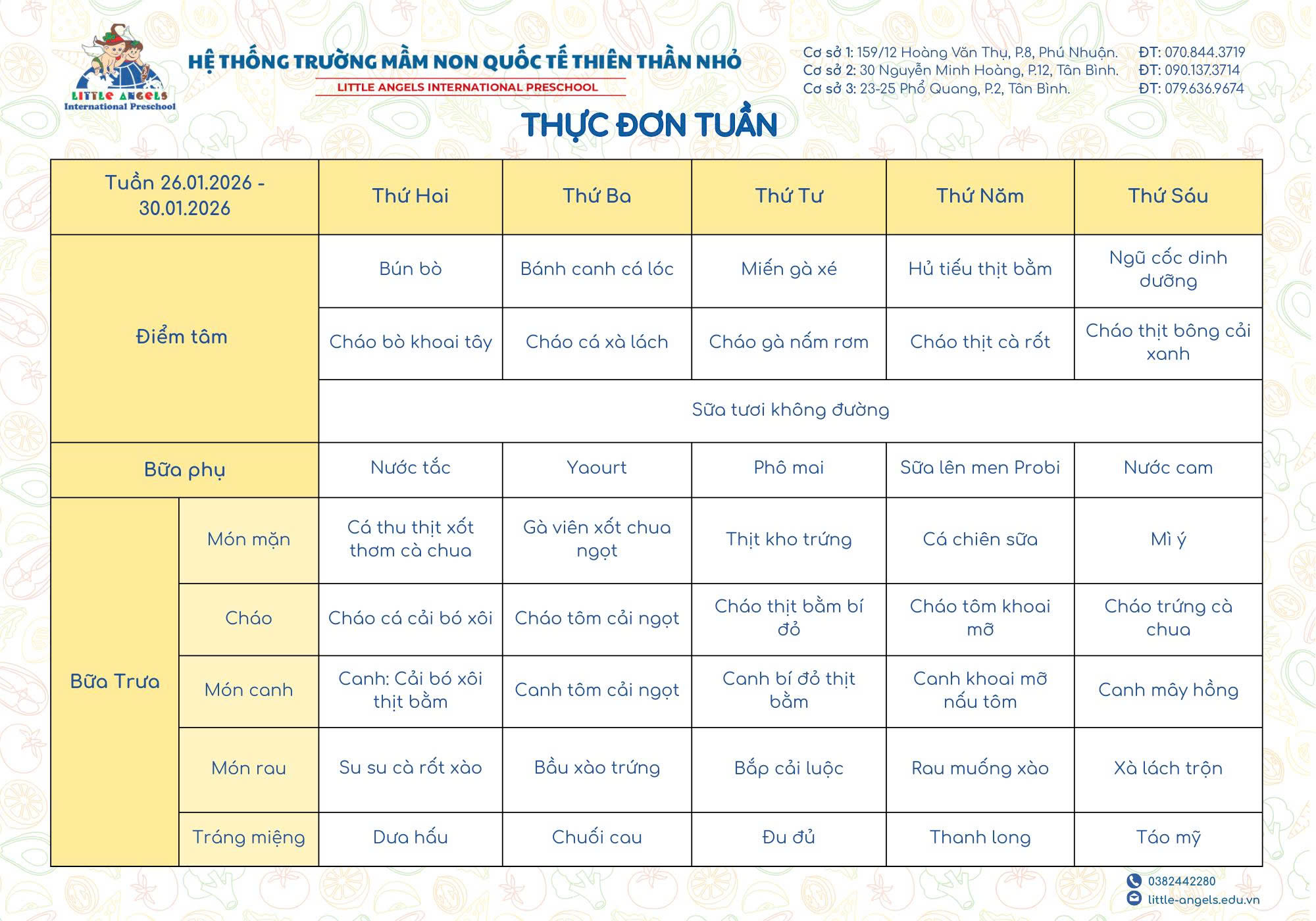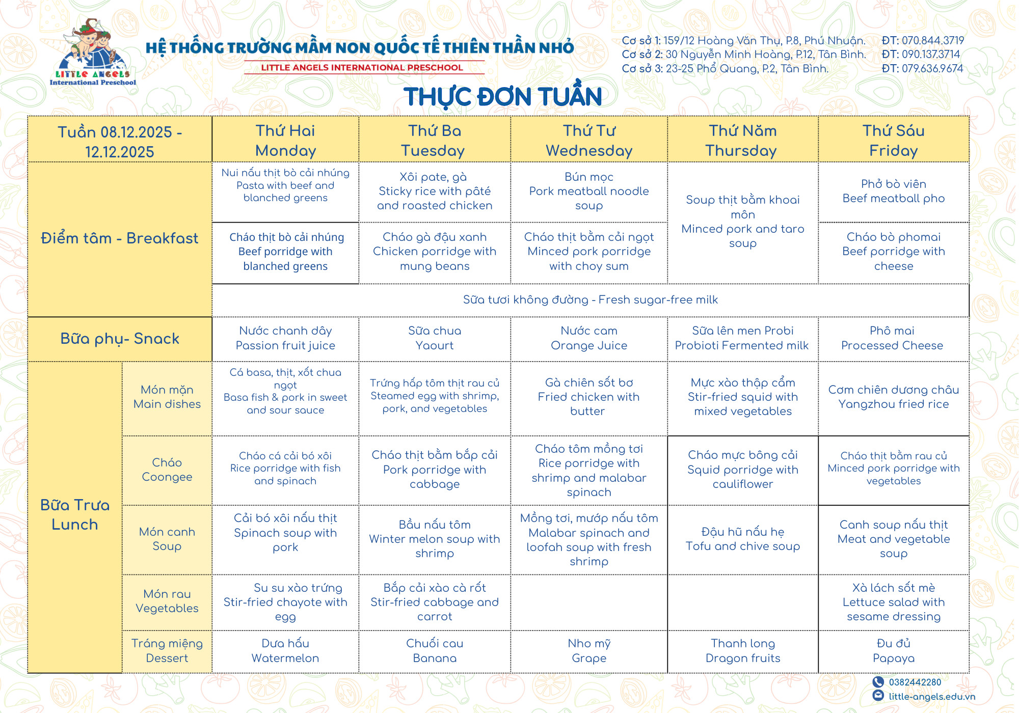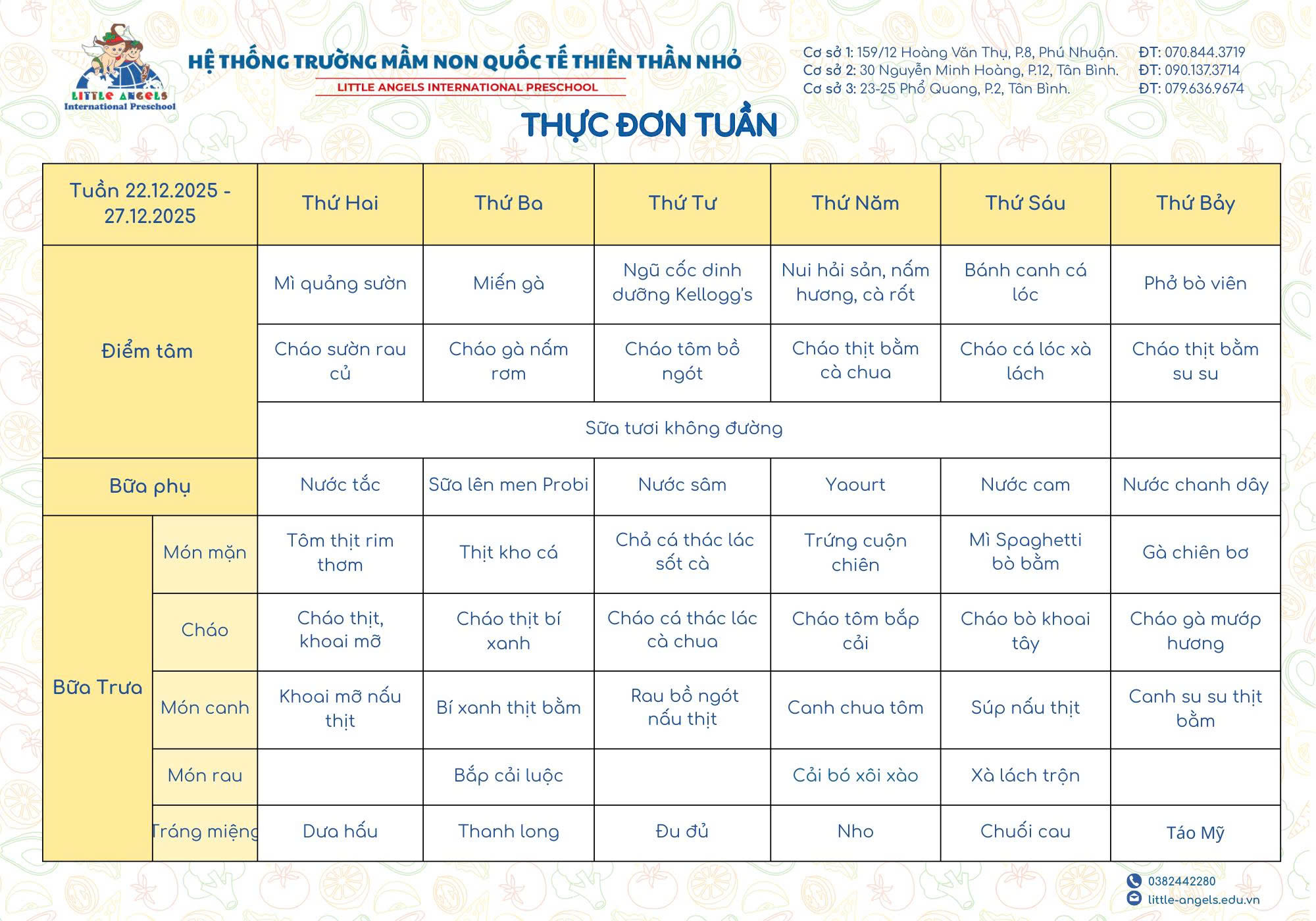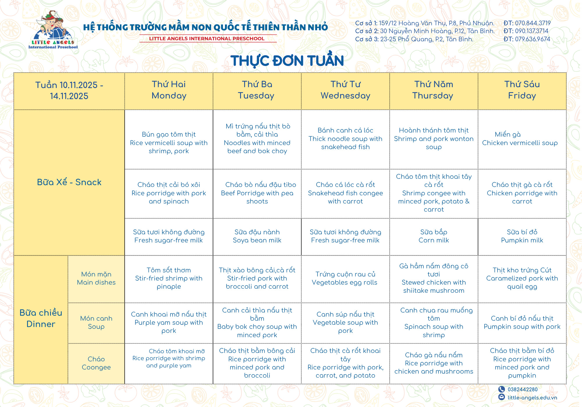 Nhà Trường xin gửi đến Quý Phụ huynh thực đơn các bữa ăn trong tuần dành cho các bé. Thực đơn được xây dựng đảm bảo đầy đủ dinh dưỡng, phù hợp với độ tuổi và mùa trong năm, giúp bé ăn ngon miệng và phát triển khỏe mạnh.